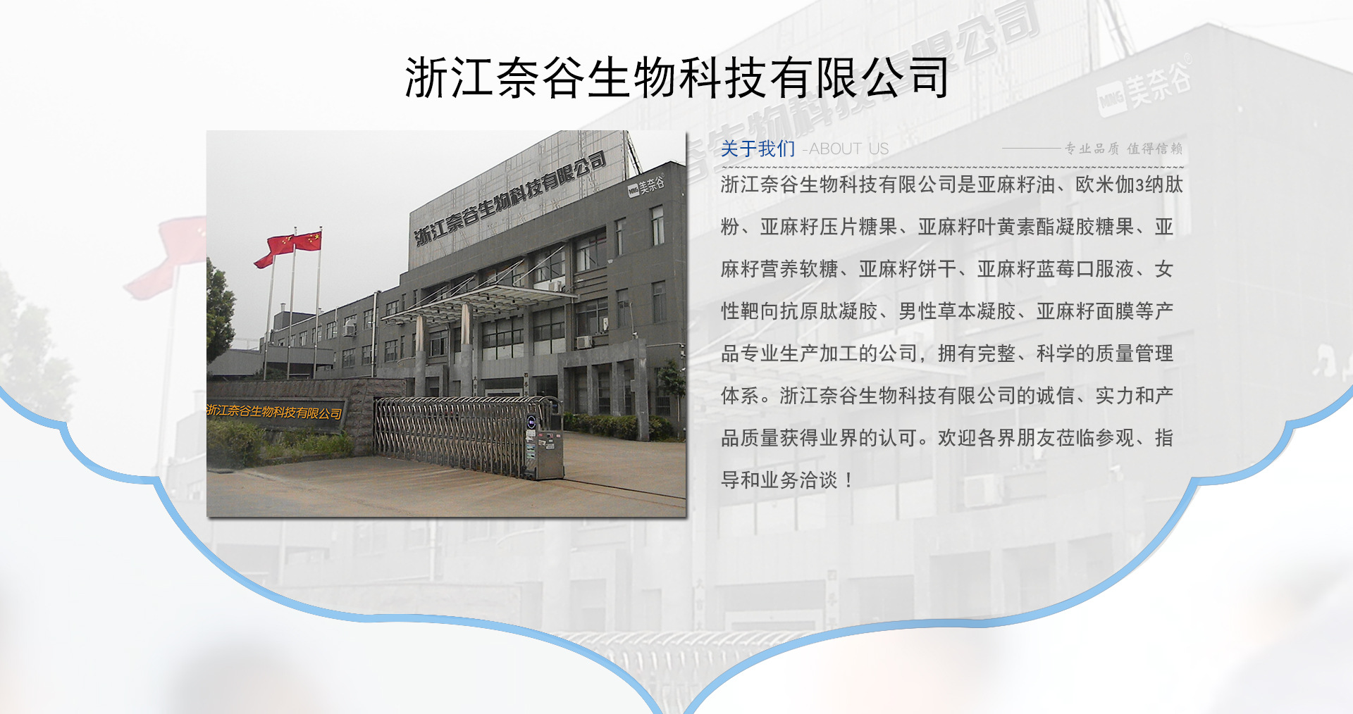 浙江奈谷生物科技有限公司是亞麻籽油、歐米伽3納肽粉、亞麻籽壓片糖果、亞麻籽葉黃素酯凝膠糖果、亞麻籽營養(yǎng)軟糖、亞麻籽餅干、亞麻籽藍莓口服液、女性靶向抗原肽凝膠、男性草本凝膠、亞麻籽面膜等產(chǎn)品專業(yè)生產(chǎn)加工的公司,擁有完整、科學(xué)的質(zhì)量管理體系。