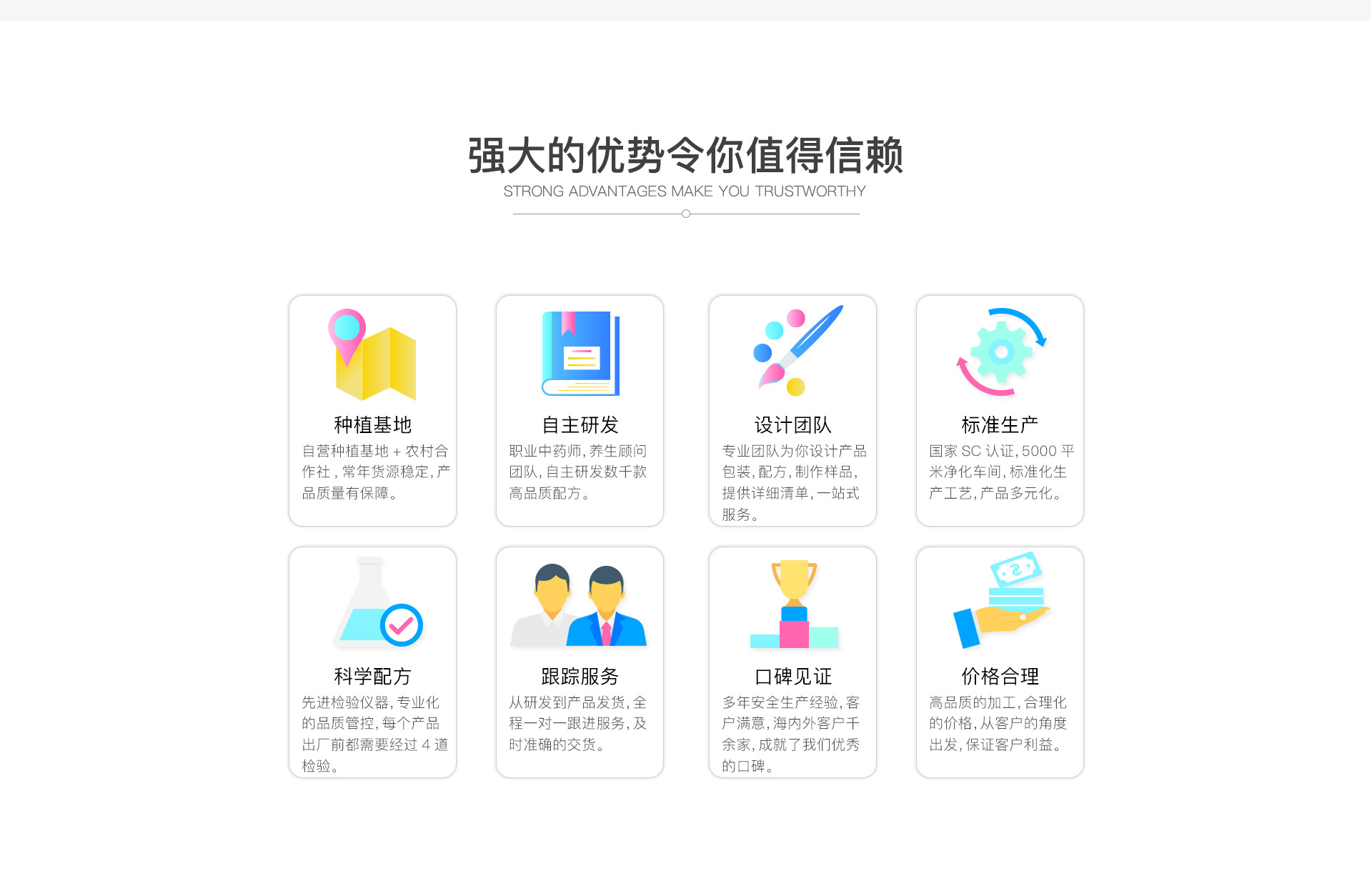 亳州市顏義堂生物科技有限公司 創建于華佗故里, 藥材之鄉的安徽亳州,近年來,顏義堂本著誠信為本,童叟無欺的經營宗旨造福于民。用藥上更是采用道地藥材,遵古炮制。祖訓:良心做藥,不許作假。號匾:濟貧解困慈善心,安老撫孤仁濟源。現顏義堂生物科技有限公司主營體質茶、三角包、水果片茶、袋泡、袋撕茶、養生茶、膏滋、丸劑代加工。公司擁有含茶制品及代用茶(袋泡茶)生產線兩條,養生茶研究實驗室、專業包裝設計團隊。可以一條龍為您提供功效配方實驗、袋泡茶加工、代用茶加工、包裝設計等服務。 所加工產品可提供SC生產許可證、執行標準,讓您只需要安心銷售,產品的一切交給我們!