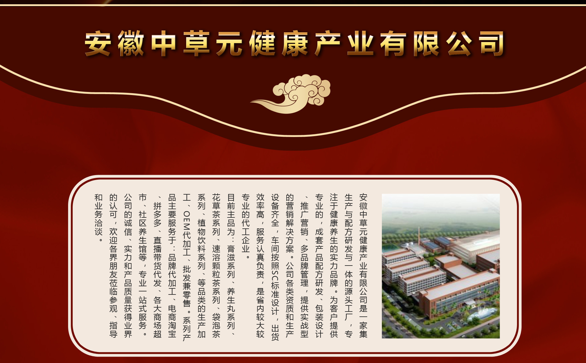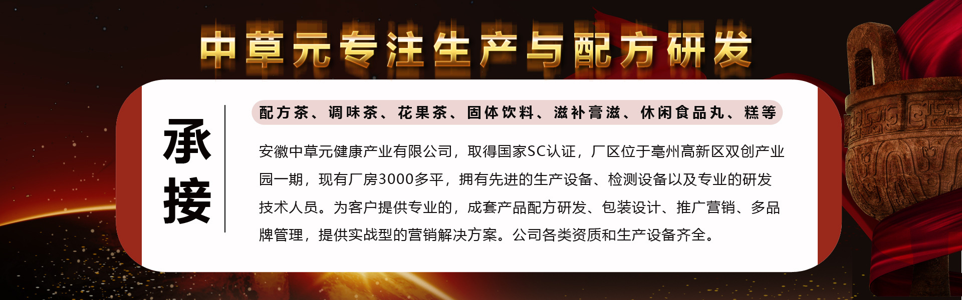 安徽中草元健康產業有限公司,于2020年成立,同時取得國家SC認證,廠區位于亳州高新區雙創產業園一期,現有廠房3000多平,擁有先進的生產設備、檢測設備以及專業的研發技術人員。集世界聞名的藥材市場-亳州地域優勢,花草茶原材料貨源純正充足;集生產與銷售為一體的綜合性企業、源頭工廠,專注于健康養生實力品牌。為客戶提供專業的,成套產品配方研發、包裝設計、推廣營銷、多品牌管理,提供實戰型的營銷解決方案。公司各類資質和生產設備齊全,車間按照SC標準設計,出貨效率高,服務認真負責,是本市較大較專業的代工企業。