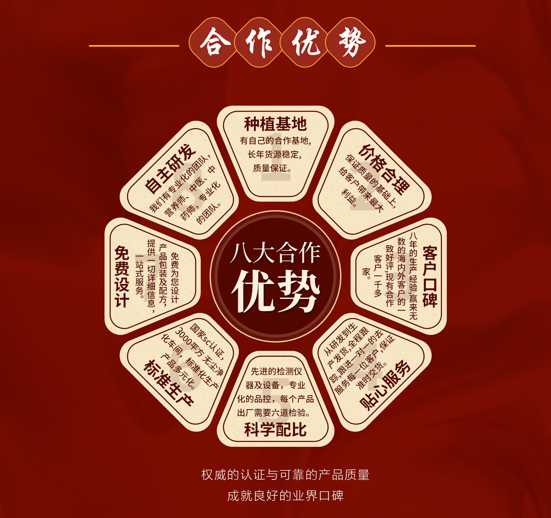 我們是代用茶、調味茶、調味料、方便食品、固體飲料、壓片糖果、養生膏丸、滋補湯包、植物飲料、足浴泡腳丸等品類的生產加工、OEM代加工、批發兼零售的專業化公司,擁有完整、科學的質量管理體系。公司的誠信、實力和產品質量獲得業界的認可。歡迎各界朋友蒞臨參觀、指導和業務洽談。