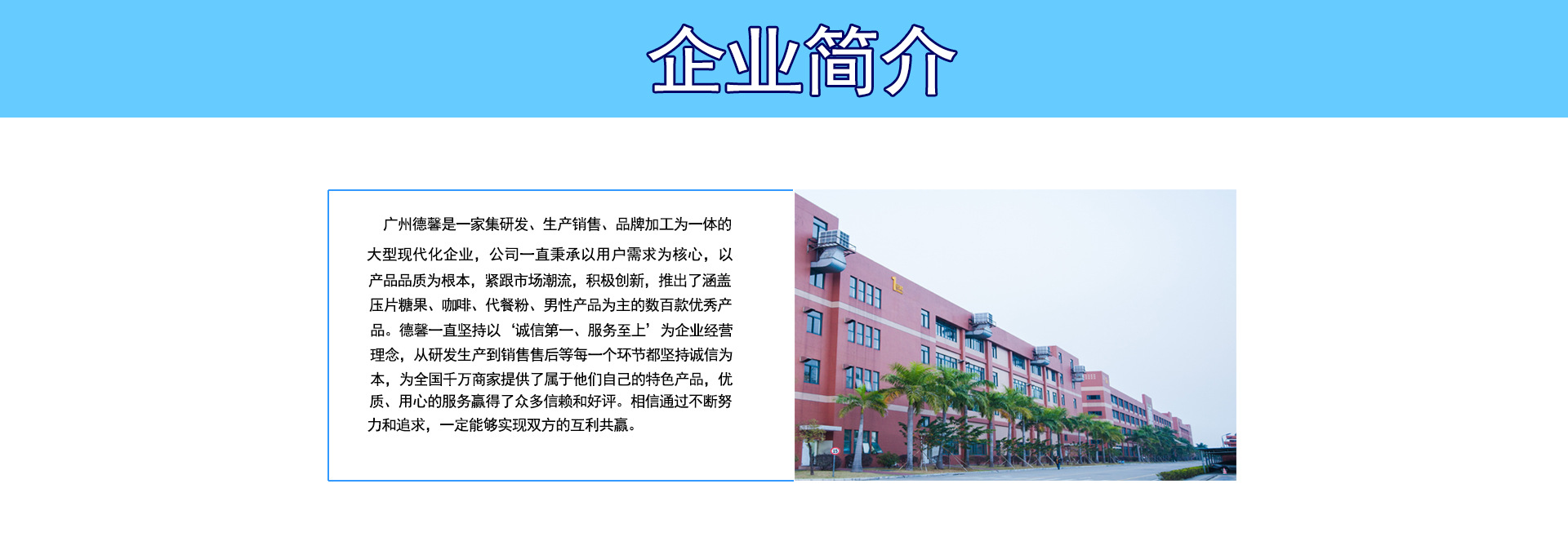 廣州德馨是一家集研發、生產、銷售、品牌加工為一體的大型現代化企業。公司一直秉承以用戶需求為核心,產品品質為根本,緊跟市場潮流,積極創新,推出了數百款優秀產品。德馨一直堅持以“誠信第一、服務至上”為企業經營理念,為全國千萬商家提供了屬于他們自己的特色產品,優質、用心的服務贏得了眾多信賴和好評,專業的售后服務體系,為客戶遇到的問題和困難提供指導幫助。我們相信,通過我們的不斷努力和追求,一定能夠實現雙方的互利共贏,讓您的企業站得更穩、走的更遠!
