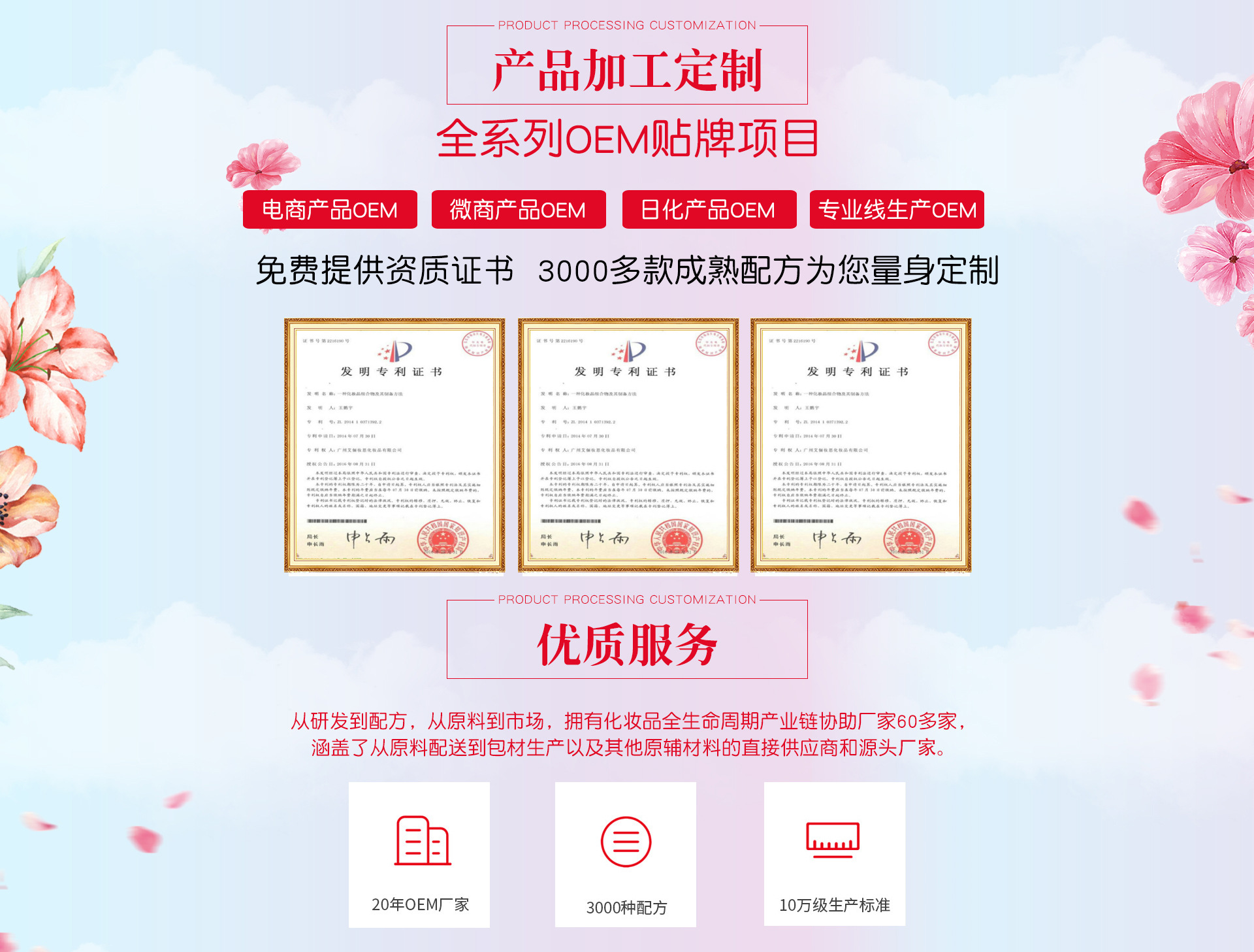 廣州艾儷妝思化妝品有限公司,成立于2008年,坐落于廣州白云區占地面積三千多平米。艾儷妝思化妝品是一家國際領先的化妝品品牌輸出基地,專為國際性化妝品品牌提供加工的平臺,為客戶提供個性化的OEM/ODM服務。涵蓋商標注冊、產品規劃、配方開發、包裝設計、功效測試、乳化、灌裝、包裝、倉儲物流等服務,是一家集研發、生產及銷售策劃為一體的專業化妝品OEM/ODM加工服務企業。 廣州艾儷妝思化妝品有限公司始終秉承“創新、共贏”的核心價值觀,以“創造客戶市場價值,推動行業持續發展”為己任,堅持“質量保證、服務為先、效率至上”的管理理念,提供“貼心、精心、耐心”的服務,不斷進行技術創新,研發安全的高品質產品,為客戶實現品牌價值和市場價值。 廣州艾儷妝思化妝品有限公司,作為有化妝品生產許可證的生產廠家,全流程為客戶提供蠶絲面膜、水乳膏霜、洗發沐浴露、精油系列等的代加工/貼牌服務。