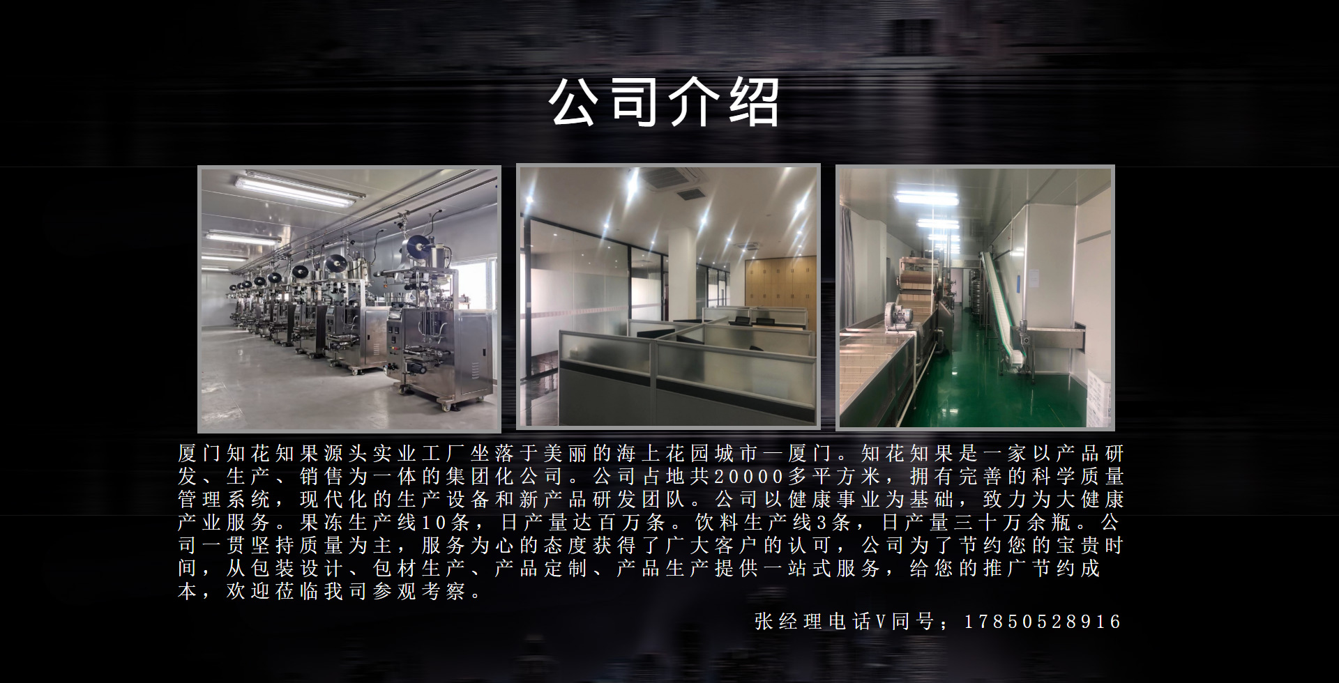 廈門知花知果源頭實業工廠坐落于美麗的海上花園城市—廈門。知花知果是一家以產品研發、生產、銷售為一體的集團化公司。公司占地共20000多平方米,擁有完善的科學質量管理系統,現代化的生產設備和新產品研發團隊。公司以健康事業為基礎,致力為大健康產業服務。果凍生產線10條,日產量達百萬條。飲料生產線3條,日產量三十萬余瓶。公司一貫堅持質量為主,服務為心的態度獲得了廣大客戶的認可,公司為了節約您的寶貴時間,從包裝設計、包材生產、產品定制、產品生產提供一站式服務,給您的推廣節約成本,歡迎蒞臨我司參觀考察。