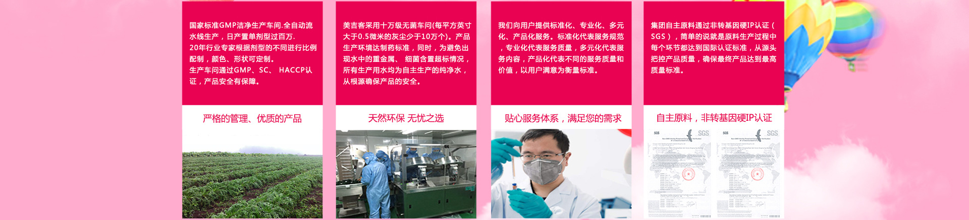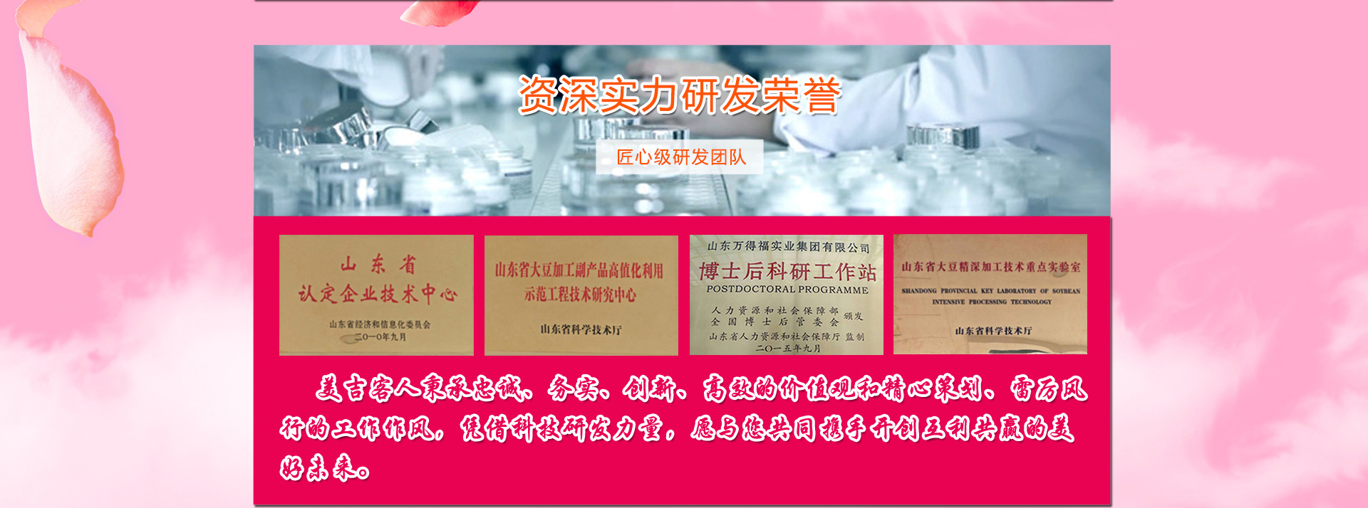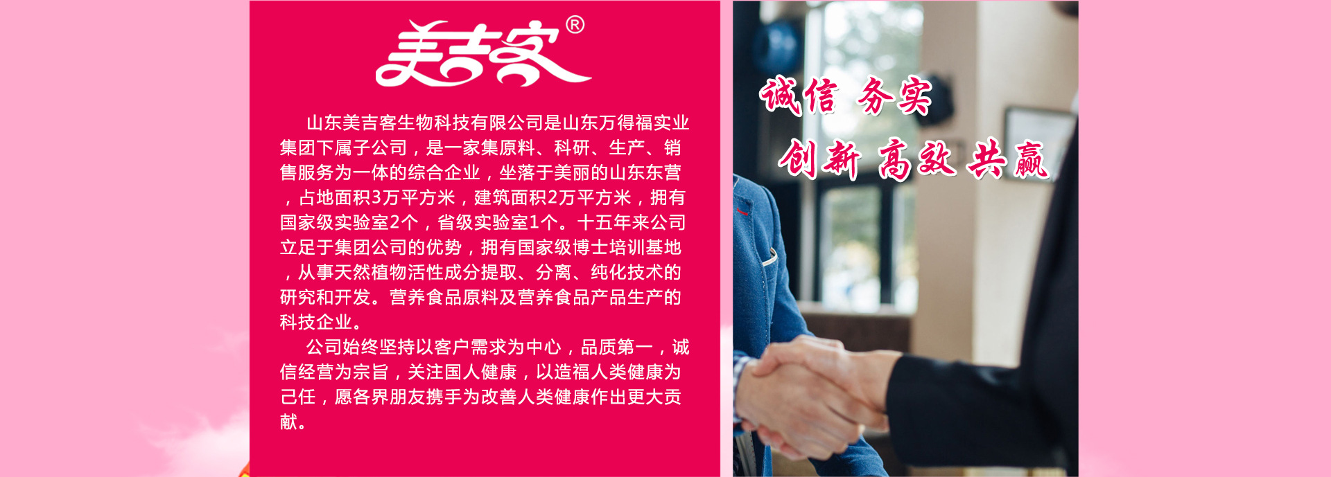 山東美吉客生物科技有限公司成立于2004年,是山東萬得福實業集團的下屬子公司,公司立足于集團公司的非轉基因大豆蛋白的生產優勢。集科研、生產和經營于一體的 現代化高科技企業,公司占地30000平方米,建筑面積20000平方米,從事科研開發的高級專業人才21人,擁有自己的中心試驗室及GMP生產車間。和國內先進的粉劑生產線。 年可生產蛋白質粉1000噸。片劑,粉劑,膠囊可為廣大客戶提供OEM業務服務。 公司自營品牌“美吉客”牌系列產品。將始終堅持以客戶的需求為中心,品質第一,誠信經營為宗旨,關注國人健康;以造福人類健康為已任,愿與各界朋友攜手為改善人類健康作出更大的貢獻。