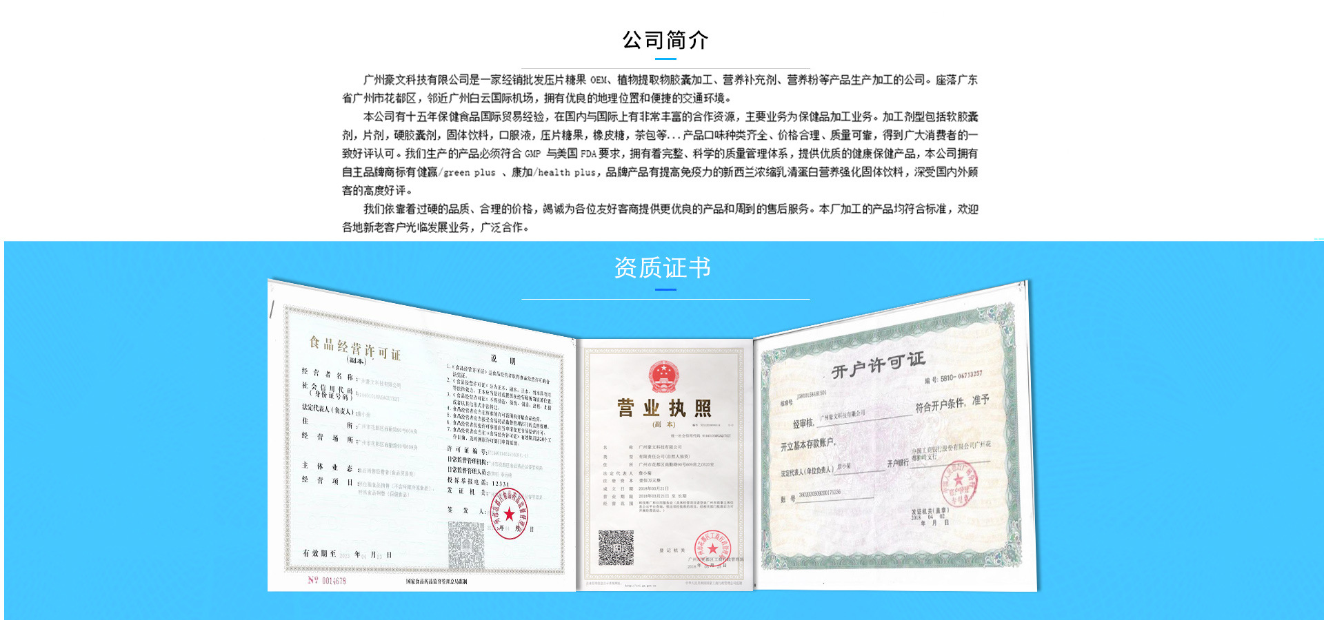 廣州豪文科技有限公司是一家經銷批發壓片糖果OEM、植物提取物膠囊加工、營養補充劑、營養粉等產品生產加工的公司。座落廣東省廣州市花都區,鄰近廣州白云國際機場,擁有優良的地理位置和便捷的交通環境。