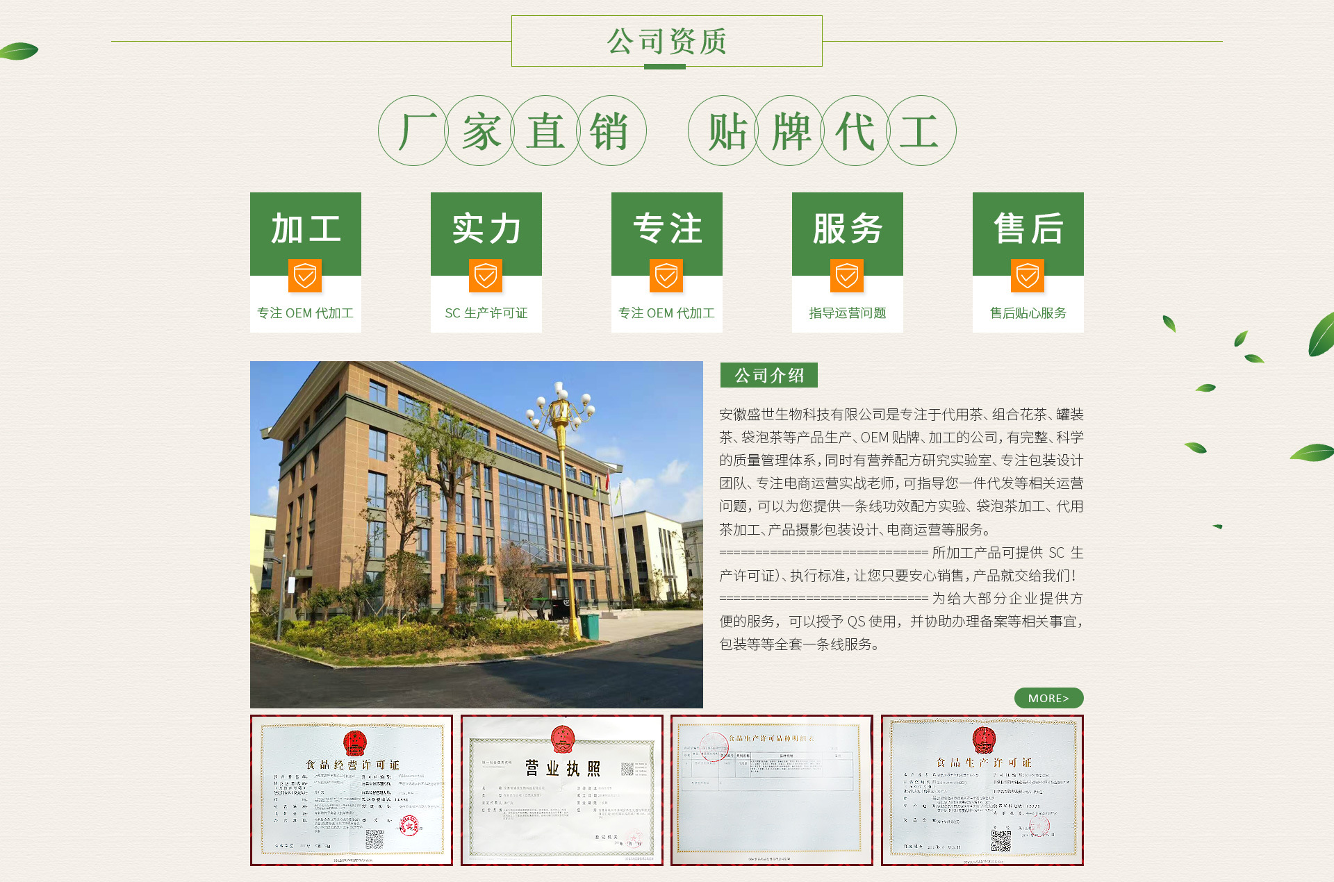 公司旗下現(xiàn)有現(xiàn)代化生產(chǎn)工廠一座,占地面積4000余平方米,位于中華四大藥都之首安徽亳州,由于多年的線下銷售,公司工廠配備有多種現(xiàn)代化生產(chǎn)包裝一體機(jī),適應(yīng)各種不同種類的產(chǎn)品生產(chǎn),工廠員工一直維持在100人左右。工廠現(xiàn)配備有一個大型原料庫,一個大型成品庫,兩個標(biāo)準(zhǔn)化無塵生產(chǎn)車間,三個普通生產(chǎn)車間。產(chǎn)品從原料選擇一直到客戶接收,建立有完善的檔案制度,以保證產(chǎn)品的可追溯性。 兩個倉庫內(nèi)常年恒溫,配備有各種防鼠防蟲設(shè)備,所有原料和成品均有嚴(yán)格區(qū)域劃分,杜絕亂堆亂放。生產(chǎn)車間員工全部要求統(tǒng)一著裝,規(guī)范著裝,從而能夠有力的保證產(chǎn)品的衛(wèi)生安全,定期對所有員工進(jìn)行培訓(xùn),加強(qiáng)員工們對產(chǎn)品的衛(wèi)生安全意識。 工廠現(xiàn)配備有生產(chǎn)設(shè)備:組合花茶包裝機(jī)60臺、全自動封罐機(jī)80臺,袋泡茶包裝機(jī)60臺、顆粒包裝機(jī)20臺、粉劑包裝機(jī)20臺、包材貼標(biāo)機(jī)20臺、打碼機(jī)5臺、熬糖鍋5口、糖塊包裝機(jī)5臺、封口機(jī)30臺等等……