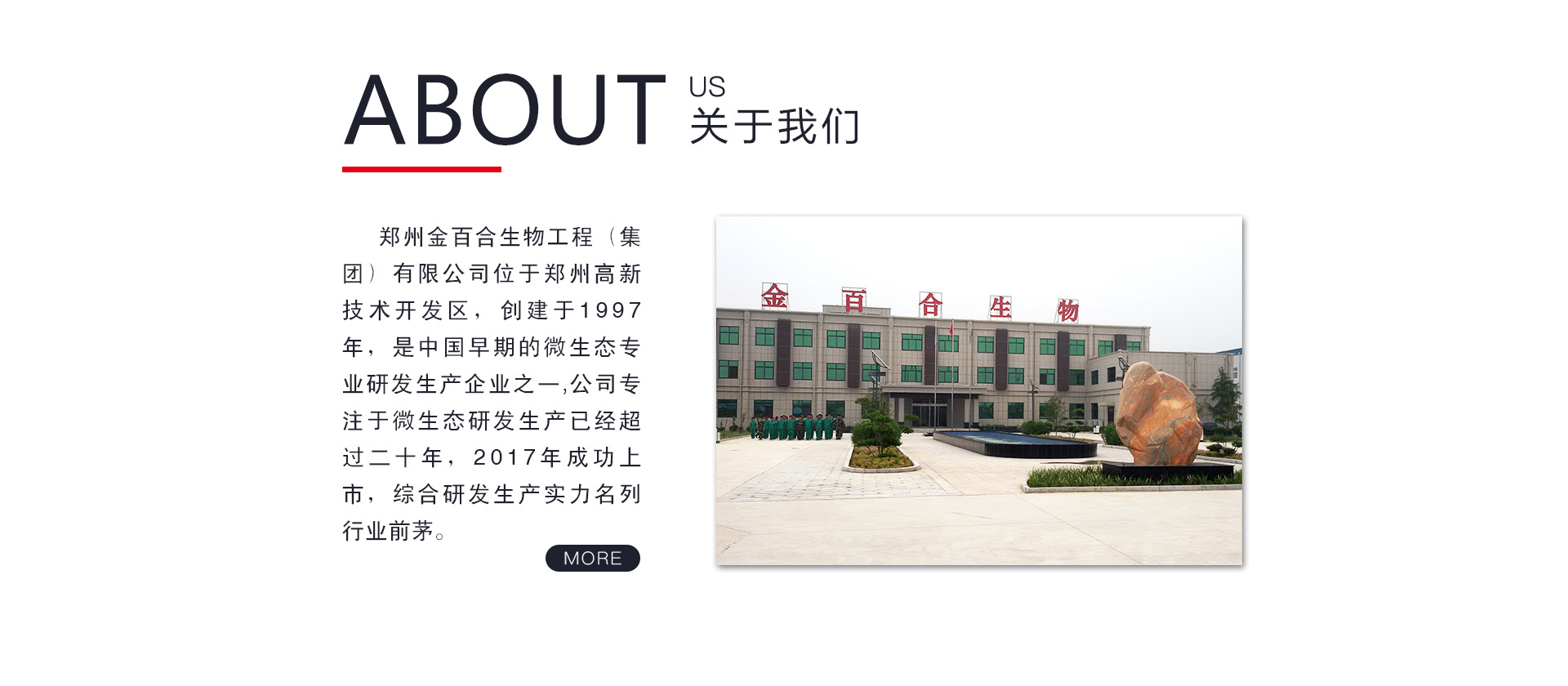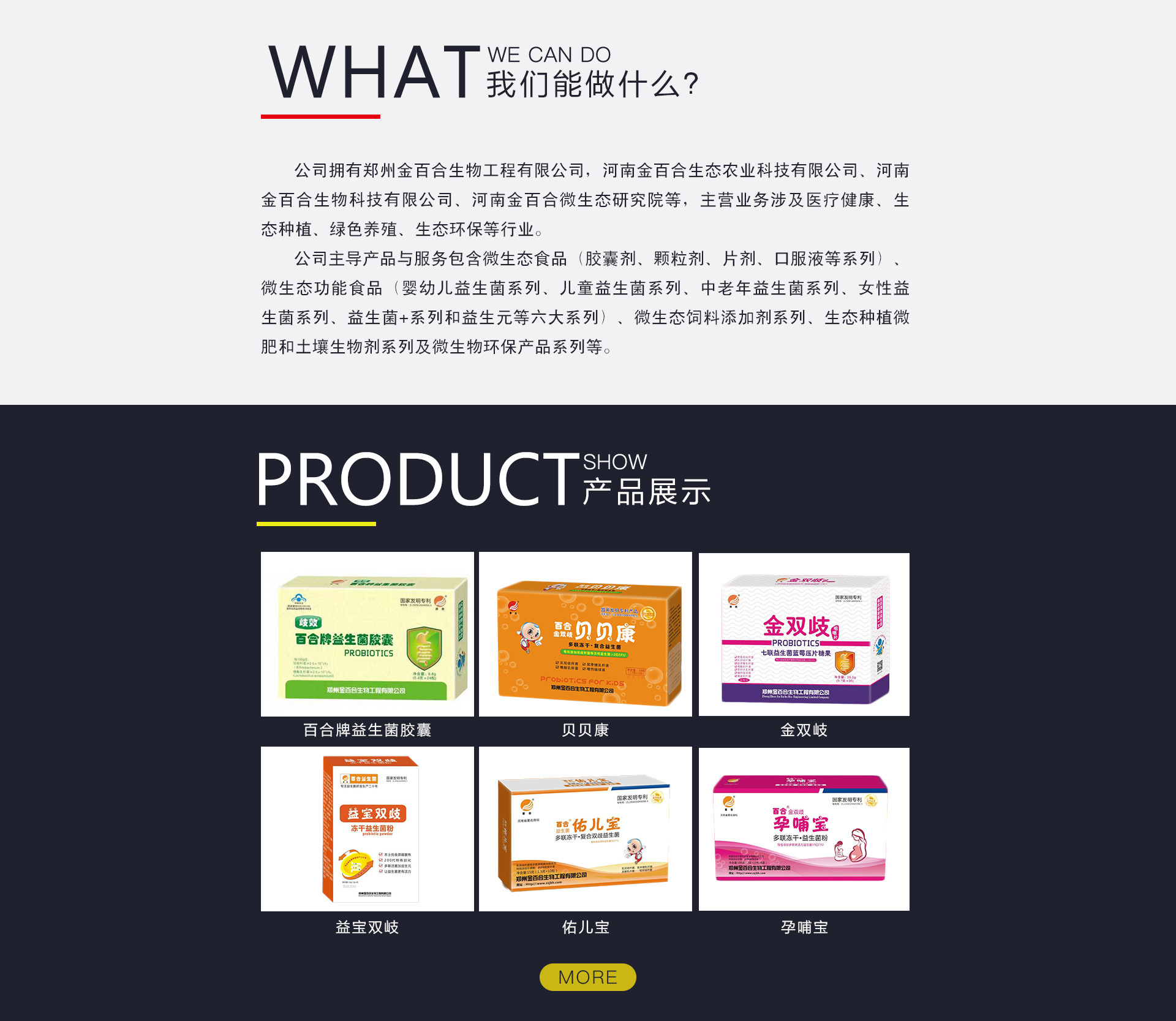 鄭州金百合生物工程有限公司位于鄭州國家高新技術開發區,公司創辦于1997年,是中國較早的功能性益生菌專業研發生產企業之一。公司專注于微生態制劑的研發、生產已經超過二十年。 公司主導產品與服務包含百合牌益生菌保健食品(歧效益生菌膠囊系列、歧效益生菌顆粒系列)、百合牌益生菌功能食品(嬰幼兒益生菌系列、兒童益生菌系列、中老年益生菌系列、女性益生菌系列、益生菌+系列、益生元系列)、金夢達牌生態種植微肥系列、百合牌微生態飼料添加劑系列、百合牌微生物環保產品系列等。