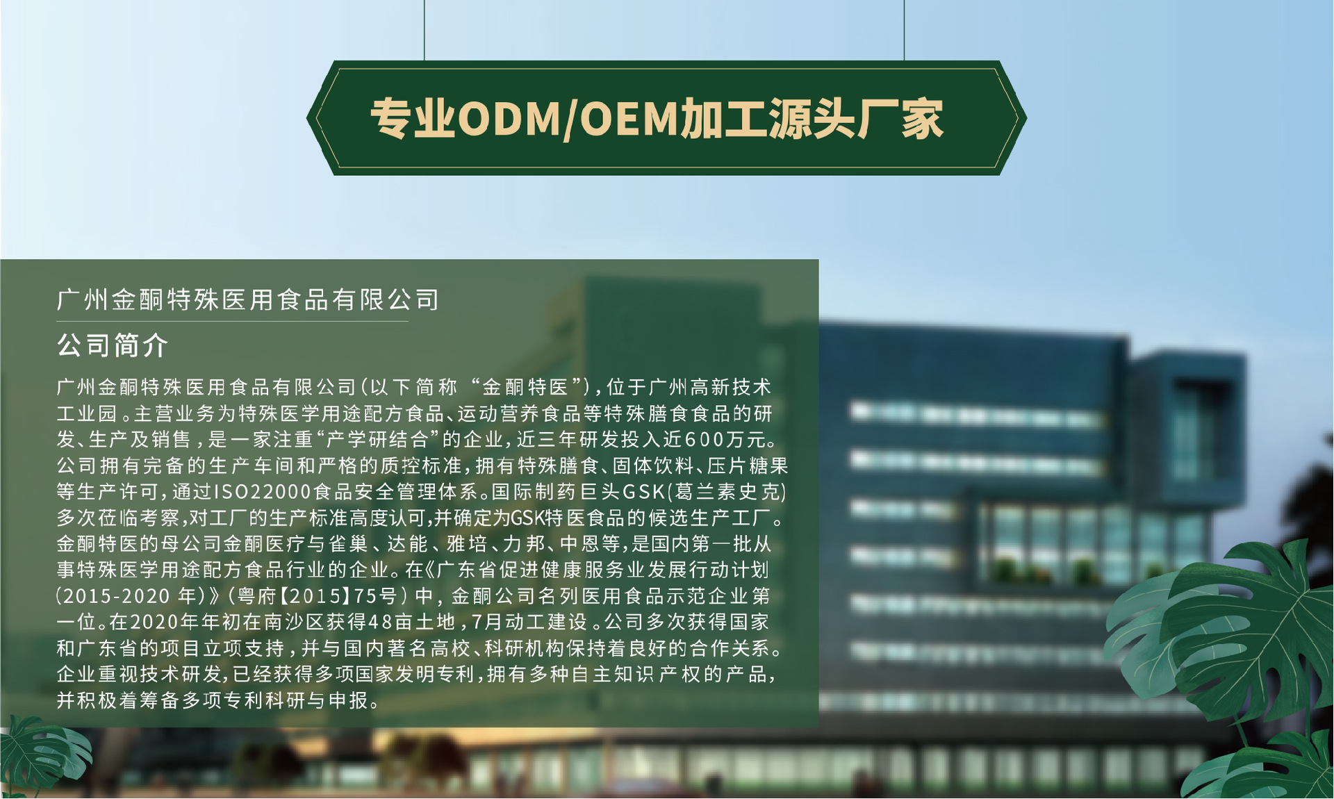 廣州金酮特殊醫用食品有限公司(原名:廣州施健生物科技有限公司)商務區位于廣州市天河區,工廠建于廣州市羅崗區科學城。我公司長期致力于健康產業的科研、代加工、原料銷售。獲得了“廣東省政府75號文健康服務行動計劃:醫用食品示范企業第一位”“綠動2011中國經濟最具發展潛力企業”、當選“中國食品科學技術學會營養支持委員會理事單位”、“營養食品設計獎最佳設計單位”。施健公司多次獲得國家和廣東省的項目立項支持,并與國內著名高校、科研機構保持著良好的合作關系。企業重視技術研發,已經獲得十多項國家發明專利,擁有多種自主知識產權的產品,并積極著籌備多項專利科研與申報。