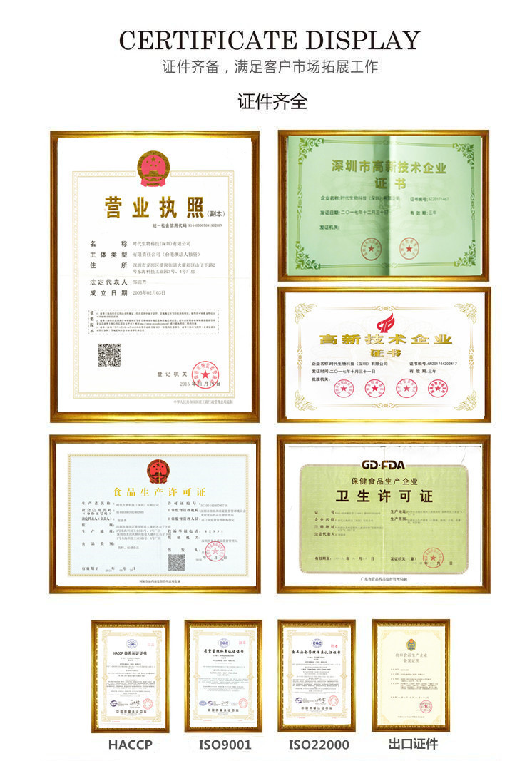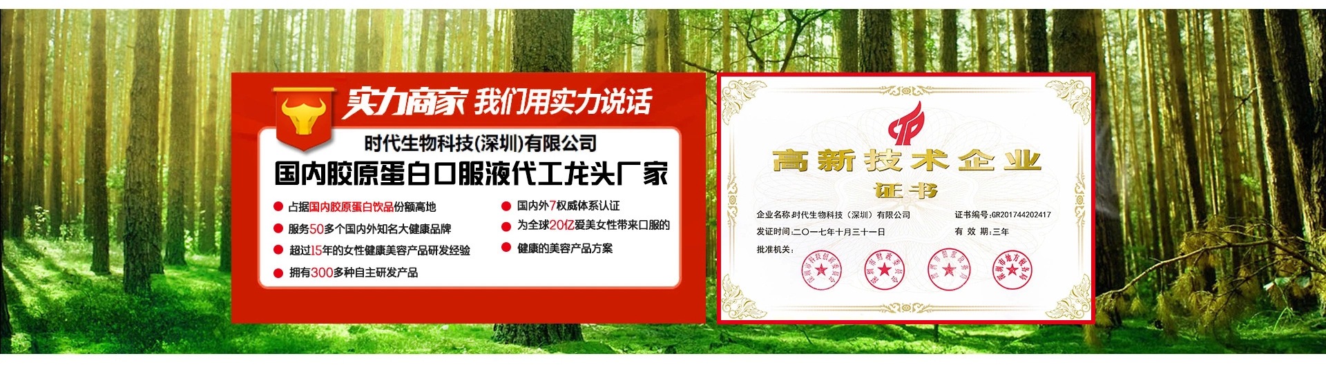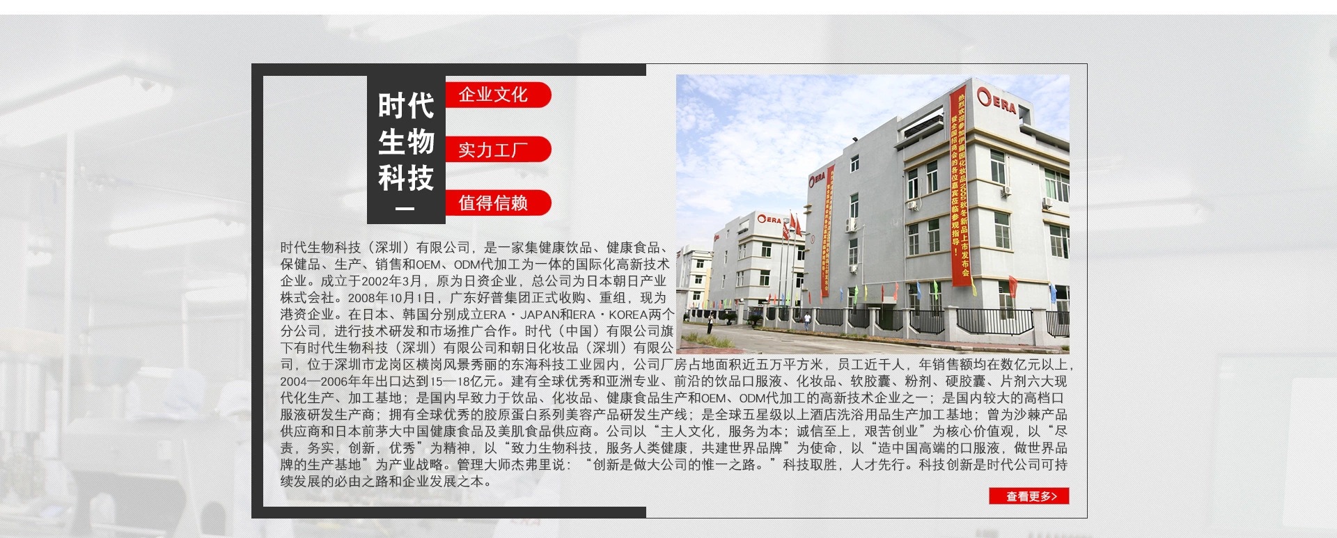 時(shí)代(中國)集團(tuán)是一家以健康口服液、美容飲品、粉劑固體飲料為主的高端技術(shù)研究、產(chǎn)品開發(fā)、生產(chǎn)和ODM代加工為一體的國際化高新技術(shù)跨國企業(yè)集團(tuán)。時(shí)代是國內(nèi)開創(chuàng)和領(lǐng)銜50ml系列健康口服液、時(shí)尚飲品ODM代加工生產(chǎn)的高新技術(shù)企業(yè),在國內(nèi)產(chǎn)能和規(guī)模均較大,擁有全球前沿的工藝技術(shù)和自動(dòng)化生產(chǎn)線,膠原蛋白系列產(chǎn)品代加工占據(jù)國內(nèi)市場(chǎng)較大份額。 18年口服液研發(fā)及生產(chǎn)經(jīng)驗(yàn); 建成3個(gè)大型現(xiàn)代化工廠,南北方生產(chǎn)基地合計(jì)超8萬平米; 擁有中、日、韓等地5個(gè)高級(jí)研發(fā)中心及實(shí)驗(yàn)室; 合作客戶遍布全球45個(gè)國家和地區(qū); 服務(wù)品牌1000個(gè)以上; 20多項(xiàng)相關(guān)發(fā)明專利; 1個(gè)綠色巨人健康管理培訓(xùn)學(xué)院; 國內(nèi)開創(chuàng)并引領(lǐng)50ml口服液發(fā)展潮流; 與國內(nèi)多所高校展開校企合作。