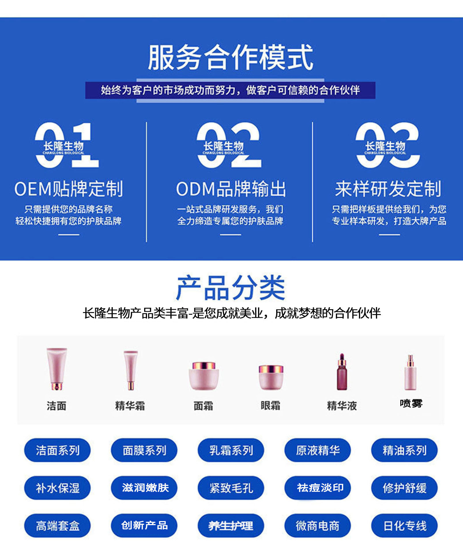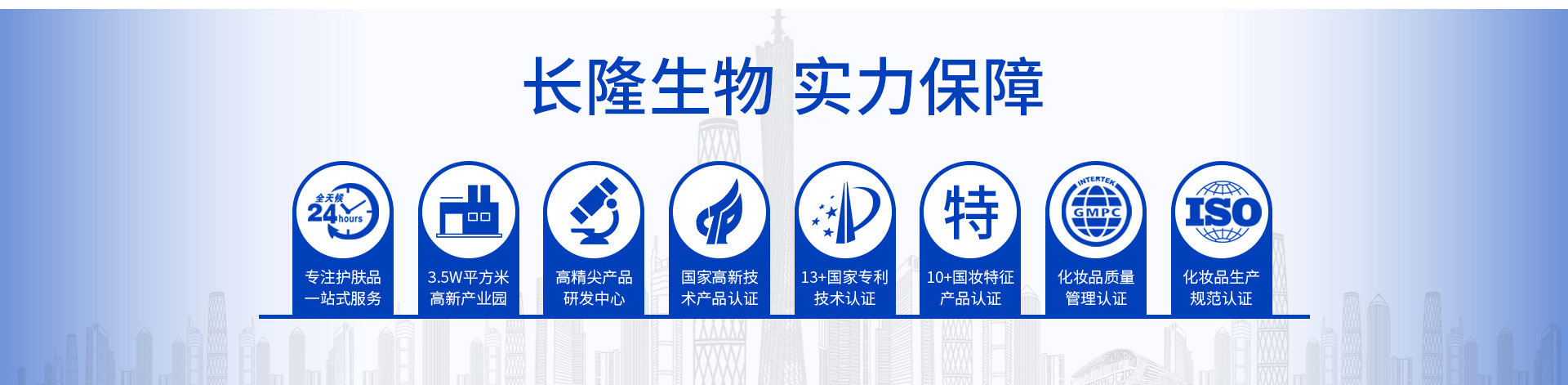 廣州長隆生物科技有限公司是中國化妝品行業(yè)科技創(chuàng)新的實(shí)力公司。本公司秉承"匠心品質(zhì),誠心服務(wù),科技創(chuàng)新"的企業(yè)精神,以市場為導(dǎo)向,以消費(fèi)者為核心,研發(fā)銷售美容護(hù)膚精品,在行業(yè)中擁有良好的聲譽(yù)。廣州長隆生物科技有限公司始終堅持以科技為依托,以市場為核心,以品質(zhì)為靈魂,發(fā)展至今,已成為一家集化妝品服務(wù)、研發(fā)、生產(chǎn)為一體的專業(yè)化妝品OEM加工企業(yè),是化妝品品牌輸出基地。擁有中國個人護(hù)理品完整、豐富的產(chǎn)品品類,產(chǎn)品覆蓋日化線、專業(yè)線、電子商務(wù)、微商、直銷等主流渠道,服務(wù)過800多家的日化企業(yè)和300家以上實(shí)力品牌商,致力打造中國優(yōu)選化妝品護(hù)理品牌生產(chǎn)供應(yīng)鏈,協(xié)助廣大合作伙伴建立自己的名牌化妝品。作為一家專注護(hù)理品代加工服務(wù)的化妝品廠家,長隆生物將竭誠為客戶提供滿意的產(chǎn)品和服務(wù)。