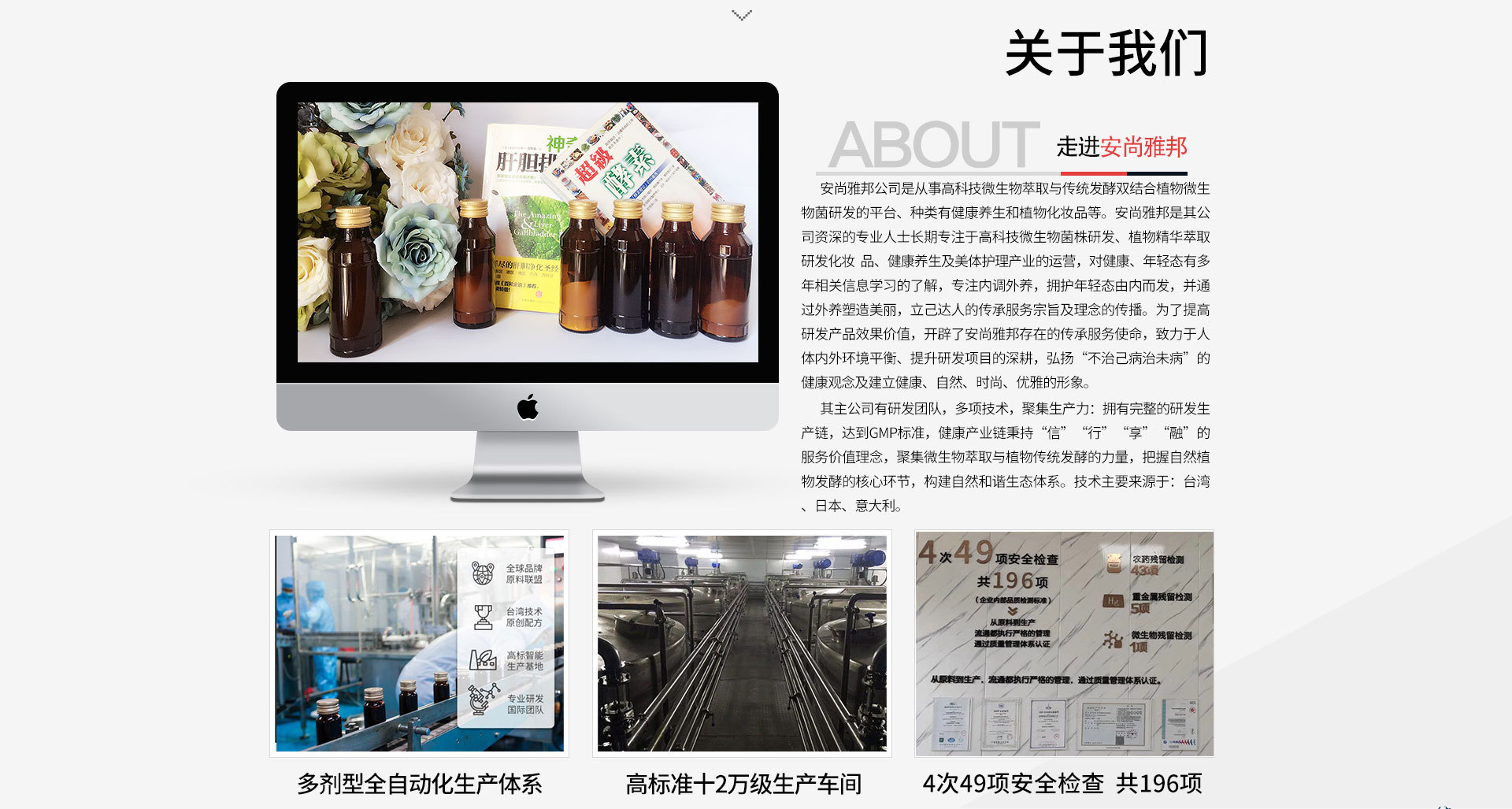 安尚雅邦(廈門)形象管理有限公司主公司是從事高科技微生物萃取與傳統發酵雙結合植物微生物菌群研發的平臺、種類有健康養生和植物化妝品等。安尚雅邦是其公司資深的專業人士長期專注于高科技微生物菌株研發、植物精華萃取研發化妝品、健康養生及美體護理產業的運營,對健康、年輕態有多年相關信息學習的了解:專注內調外養,擁護年輕態由內而發,并通過外養塑造美麗,立己達人的傳承服務宗旨及理念的傳播。為了提高研發產品效果價值,開辟了安尚雅邦存在的傳承服務使命:致力于人體內外環境平衡、提升研發項目的深耕,弘揚“不治已病治未病”的健康觀念及建立健康、自然、時尚、優雅的形象。 其主公司有研發團隊,多項技術,聚集生產力:擁有完整的研發生產鏈,達到GMP標準,健康產業鏈秉持“信”“行”“享”“融”的服務價值理念,聚集微生物萃取與植物傳統發酵的力量,把握自然植物發酵的核心環節,構建自然和諧生態體系。 技術主要來源于:臺灣、日本。