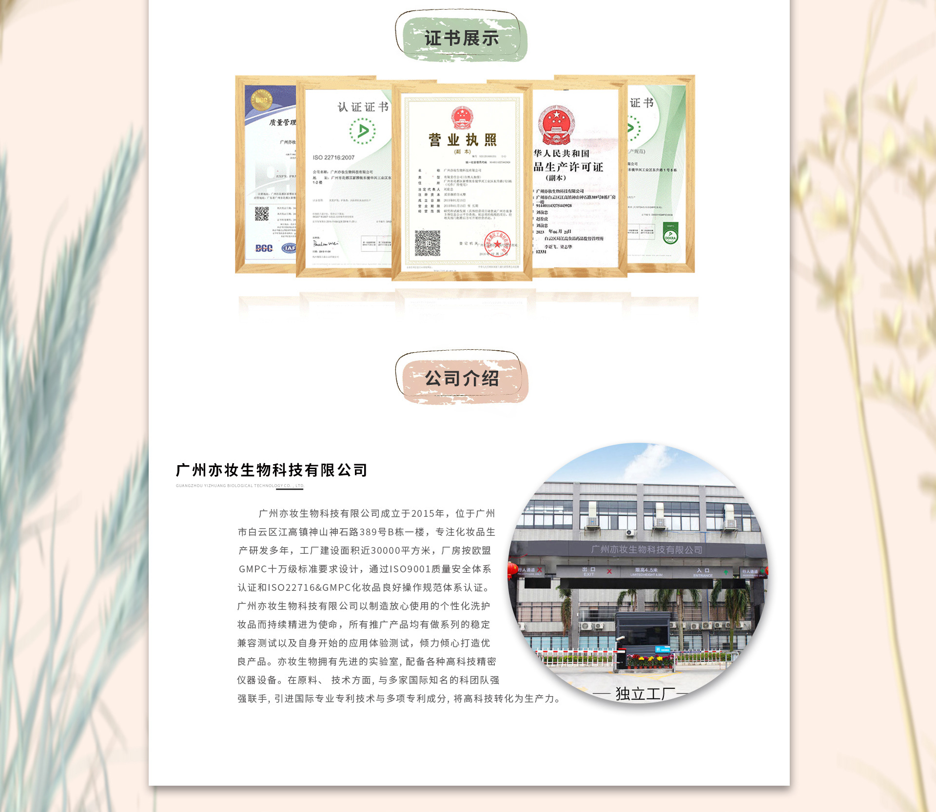 廣州亦妝生物科技有限公司成立于2015年,公司地址位于廣州市白云區江高鎮神山神石路389號B棟一樓,專注化妝品生產研發16年,工廠建設面積近30000平方米,廠房按歐盟GMPC十萬級標準要求設計,通過ISO9001質量安全體系認證和ISO22716&GMPC化妝品良好操作規范體系認證。廣州亦妝生物科技有限公司以制造放心使用的個性化洗護化妝品而持續精進為使命,所有推廣產品均有做系列的穩定兼容測試以及自身開始的應用體驗測試,傾力傾心打造優質產品。 亦妝生物擁有先進的實驗室, 配備各種高科技精密儀器設備。在原料、 技術方面, 與多家國際知名的科研團隊強強聯手, 引進國際頂尖專利技術與多項專利成分, 致力于將高科技轉化為生產力。