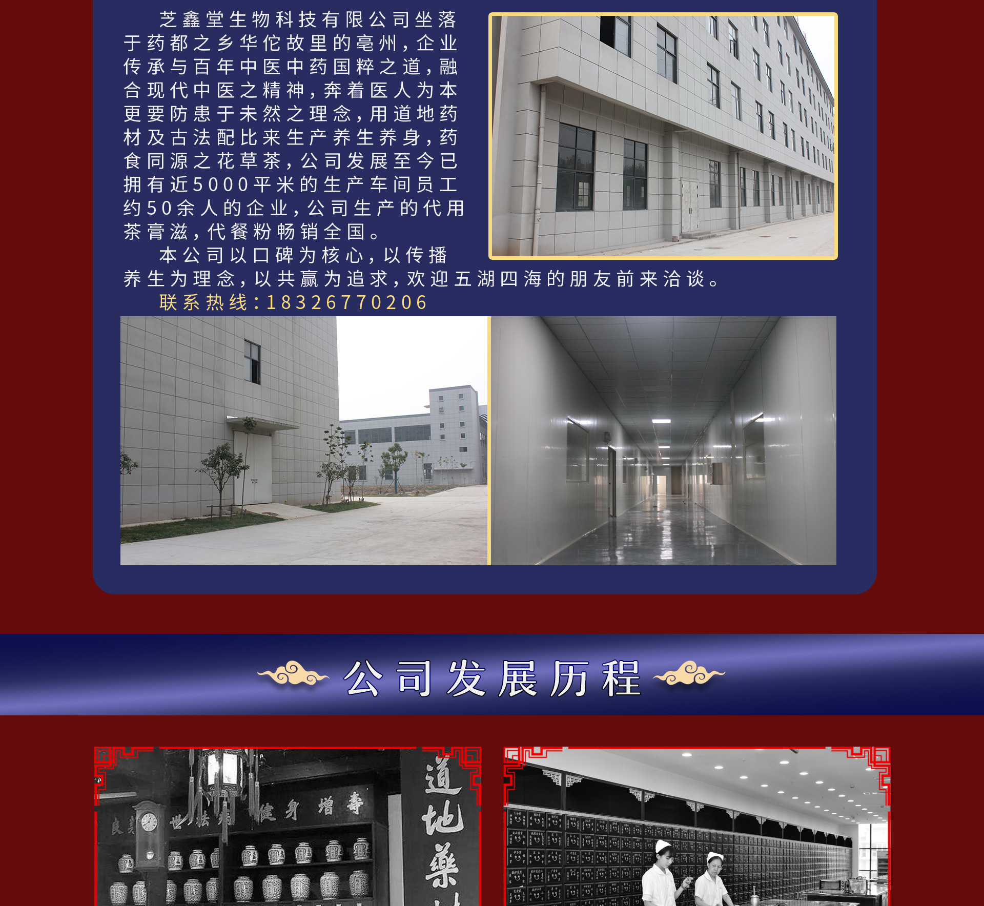 安徽芝鑫堂生物科技公司坐落四大藥材交易中心之首,譽有藥材之鄉(xiāng)的安徽亳州。公司自成立之日起,以傳播養(yǎng)生理念為己任,以誠信經(jīng)營為基石,以合作共贏為追求,生產(chǎn)的代用茶,調(diào)味茶,膏滋,代餐粉暢銷全國,與多家知名企業(yè)代工合作。一次合作,終身朋友,歡迎全國各地的朋友參觀,指導洽談。