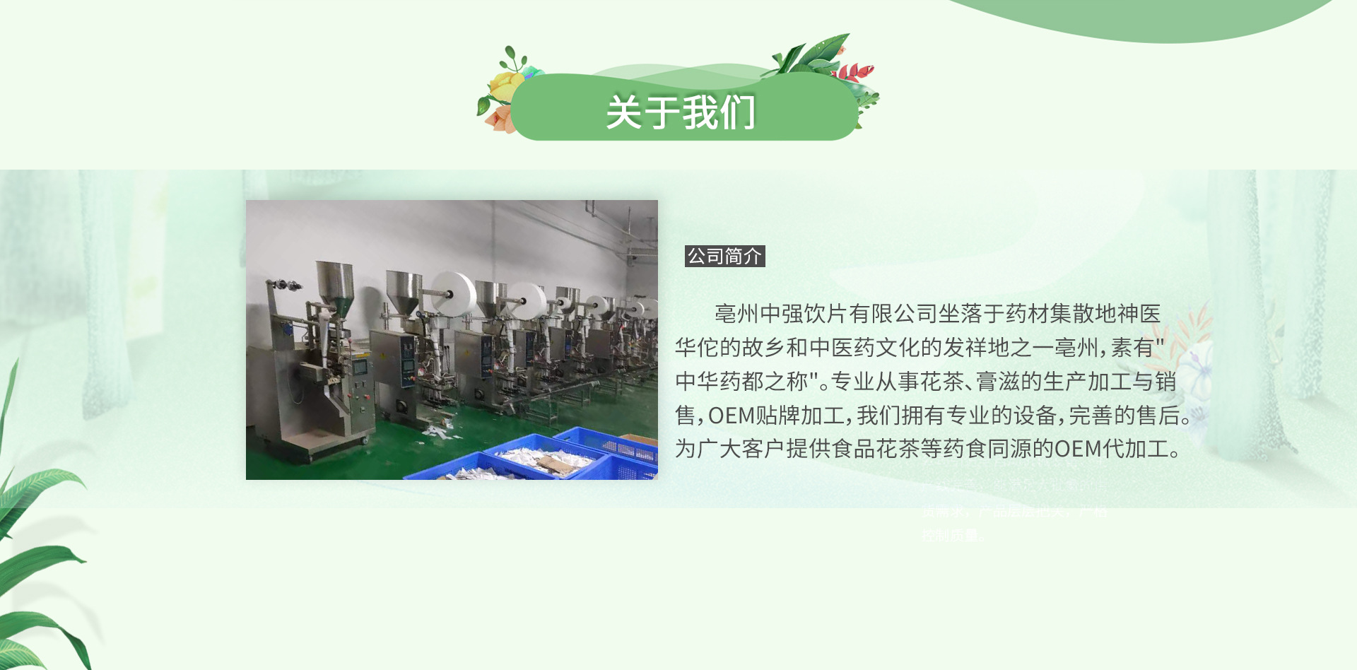 亳州中強中藥飲片有限公司是花草茶、花果茶、代泡茶、雜糧、天然粉粉等、花草茶、花果茶、代泡茶、雜糧、天然粉粉等等產品專業生產加工的公司,擁有完整、科學的質量管理體系。亳州中強中藥飲片有限公司的誠信、實力和產品質量獲得業界的認可。歡迎各界朋友蒞臨參觀、指導和業務洽談。