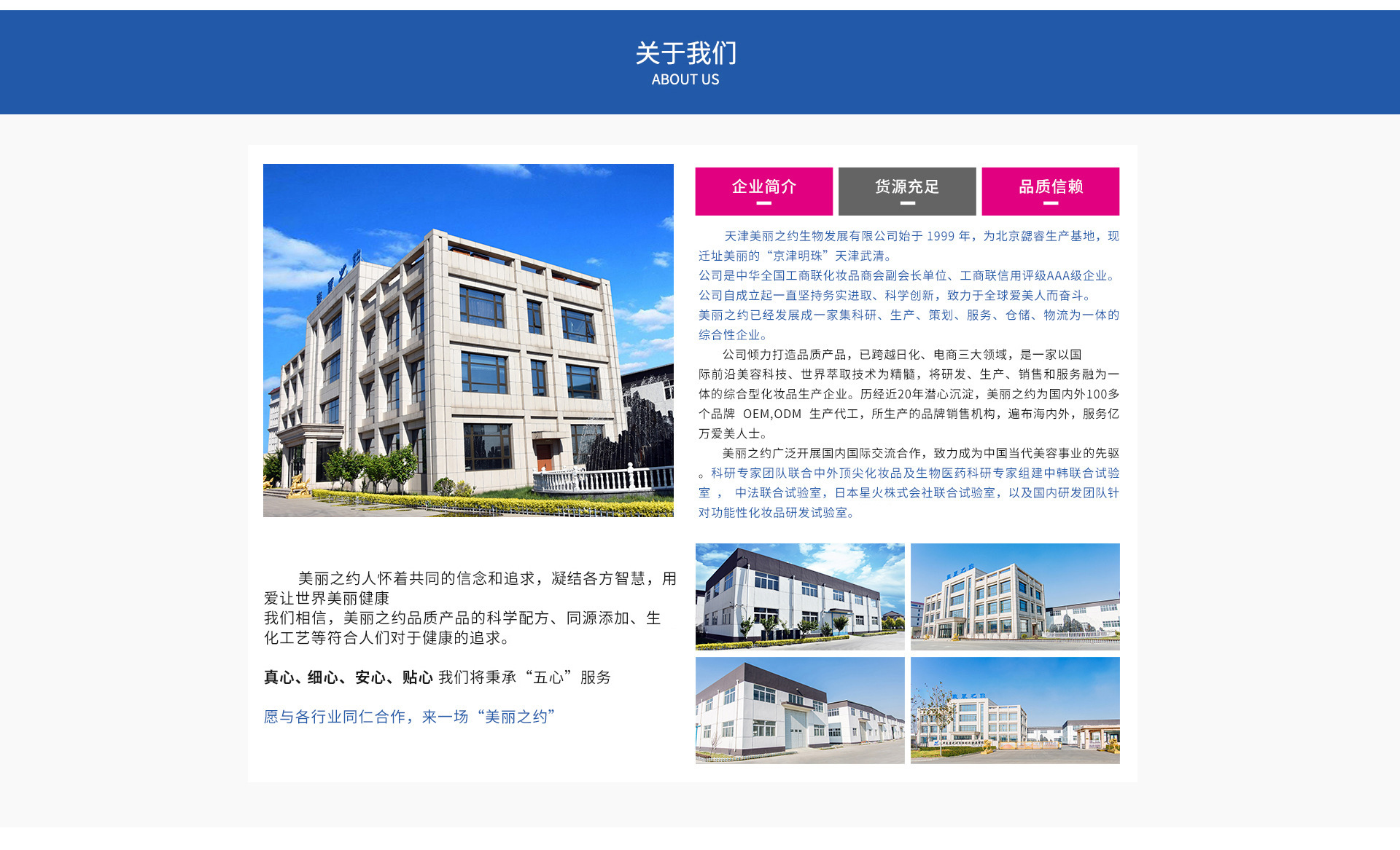 天津美麗之約生物發展有限公司始于 1999 年,現遷址美麗的“京津明珠”天津武清。 公司是中華全國工商聯化妝品商會副會長單位、工商聯信用評級AAA級企業。 美麗之約已經發展成一家集科研、生產、策劃、服務、倉儲、物流為一體的綜合性企業。 公司傾力打造優質產品,已跨越專業、日化、電商三大領域,是一家以國際前沿美容科技、發酵萃取技術為精髓,將研發、生產、銷售和全方位服務融為一體的綜合型化妝品生產企業。歷經近20 年潛心沉淀,美麗之約為國內外100多個品牌 OEM,ODM 生產代工,所生產的品牌銷售機構,遍布海內外;美麗之約 做好賣的產品,讓美麗成為一種習慣!