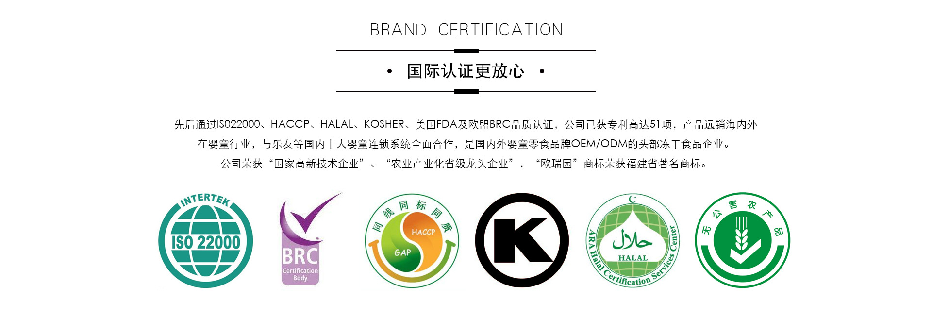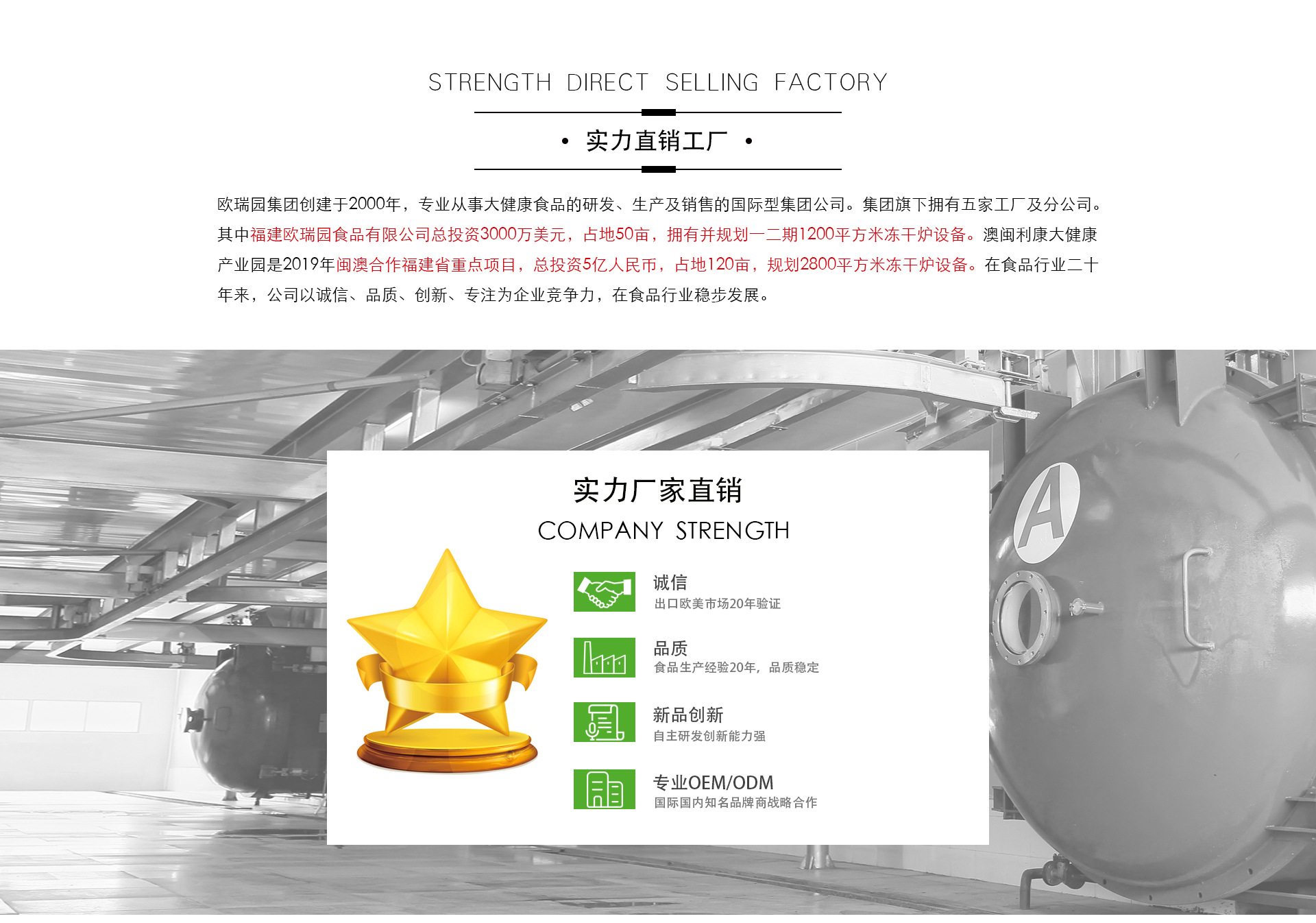 歐瑞園集團(tuán)創(chuàng)建于2000年,專業(yè)從事大健康食品的研發(fā)、生產(chǎn)及銷售的國際型集團(tuán)公司。集團(tuán)旗下?lián)碛形寮夜S及分公司。其中福建歐瑞園食品有限公司總投資3000萬美元,占地50畝,擁有并規(guī)劃一二期1600平方米凍干爐設(shè)備。澳閩利康大健康產(chǎn)業(yè)園是2019年閩澳合作福建省重點(diǎn)項(xiàng)目,總投資5億人民幣,占地120畝,規(guī)劃3200平方米凍干爐設(shè)備。在食品行業(yè)二十年來,公司以誠信、品質(zhì)、創(chuàng)新、專注為企業(yè)競爭力,在食品行業(yè)穩(wěn)步發(fā)展。