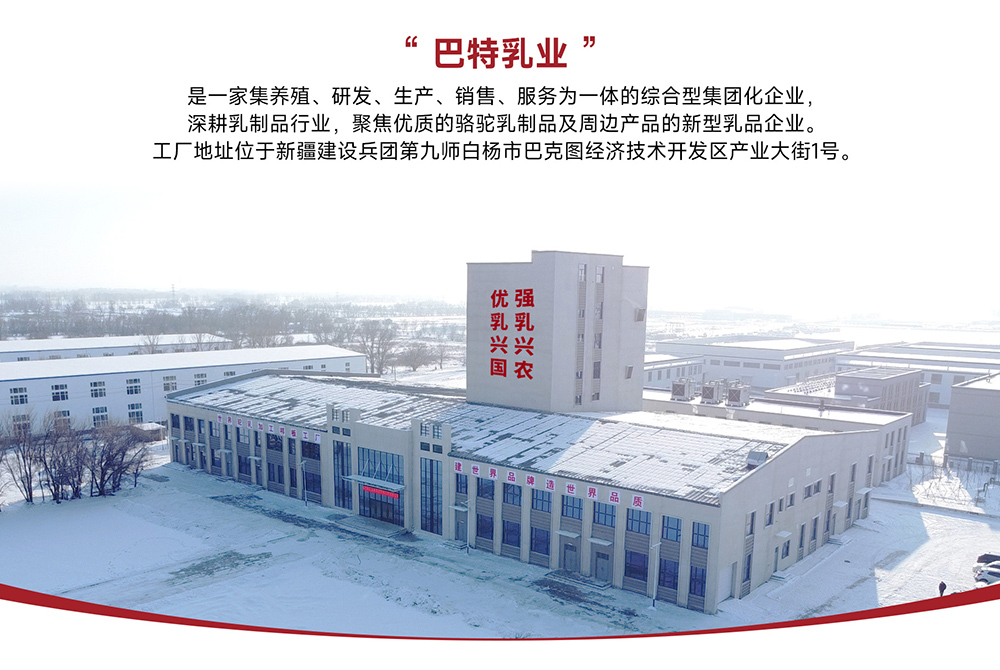 依巴特乳業(yè)集團是一家集養(yǎng)殖、生產(chǎn)、研發(fā)、銷售、服務(wù)為一體的綜合型集團化企業(yè),深耕乳制品行業(yè),聚焦優(yōu)質(zhì)駱駝乳制品及周邊產(chǎn)品的新型乳品企業(yè)。依巴特品牌名稱“巴特”在哈薩克語里有勇敢、強壯、絕不屈服的寓意。我們依靠這樣的精神打造“創(chuàng)造全球一流駝乳產(chǎn)品,成為中國最自豪駝乳企業(yè)”的企業(yè)愿景。