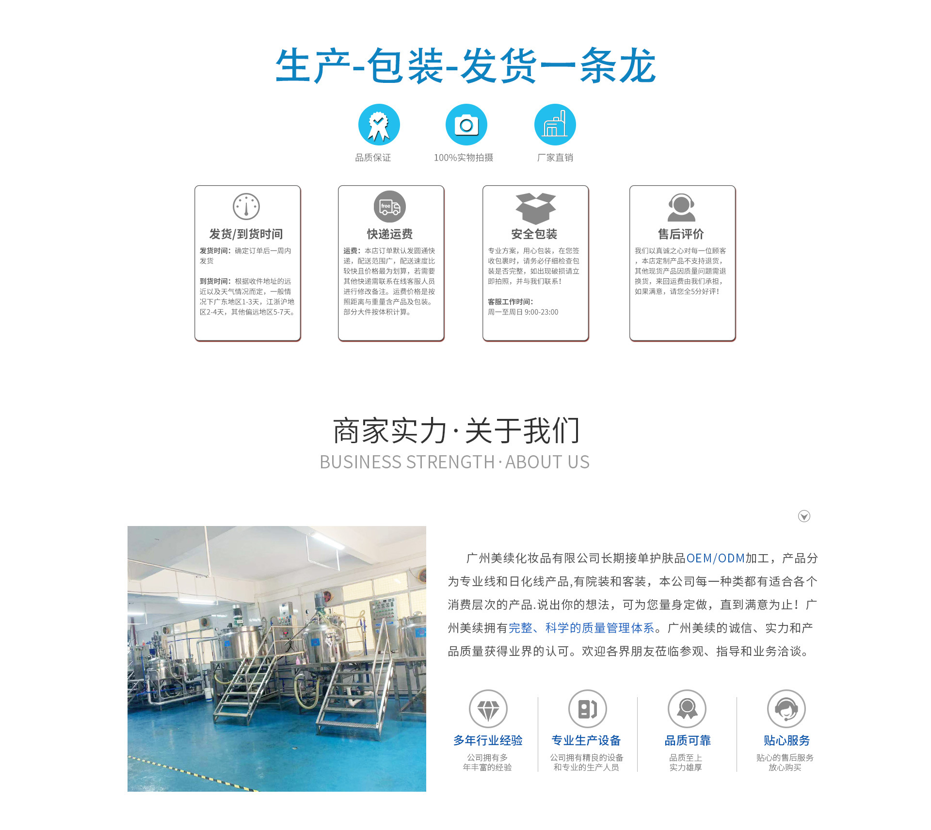 廣州美續化妝品有限公司是一家專業的OEM/ODM護膚產品生產加工的公司,擁有完整、科學的質量管理體系。廣州美續化妝品有限公司的誠信、實力和產品質量獲得業界的認可。歡迎各界朋友蒞臨參觀、指導和業務洽談。我們的企業宗旨:為顧客提供超值的產品和優質的服務我們的企業理念:關心每一位員工的成長,提升每一位員工的價值我們的管理方針:在制度化為原則的基礎上,以人為本充分發揮每個人的潛能,能者上,庸者下,閑者走我們的企業精神。公司一直堅持“ 質量是企業的生命”的指導原則 ,建立有一套完善的從原料、小試、中試、半成品到穩定性、安全性及功效性檢測的質量保證體系。我們產品齊全,質量保證,生產能力強,交貨及時產品性價比高,還可根據客戶的具體要求量身訂造產品。訂貨量不限,依量訂價。公司將一如既往秉承“質量保證,信譽至上”的指導思想,堅持“始終將客戶利益放在首位”、 “ 互利互惠共同發展”的經營宗旨.