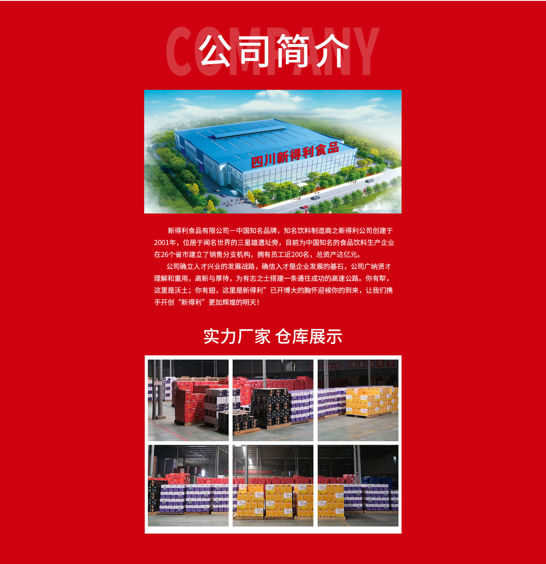 新得利食品有限公司一中國知名品牌,知名飲料制造商之新得利公司創建于2001年,位居于聞名世界的三星堆遺址旁,目前為中國知名的食品飲料生產企業。在26個省市建立了銷售分支機構,擁有員工近200名,總資產達億元。 公司確立人才興業的發展戰路,確信人才是企業發展的基石,公司廣納賢才,理解和重用,高薪與厚待,為有志之士搭建一條通往成功的高速公路。你有犁,這里是沃土;你有翅,這里是新得利”已開博大的胸懷迎候你的到來,讓我們攜手開創“新得利”更加輝煌的明天!