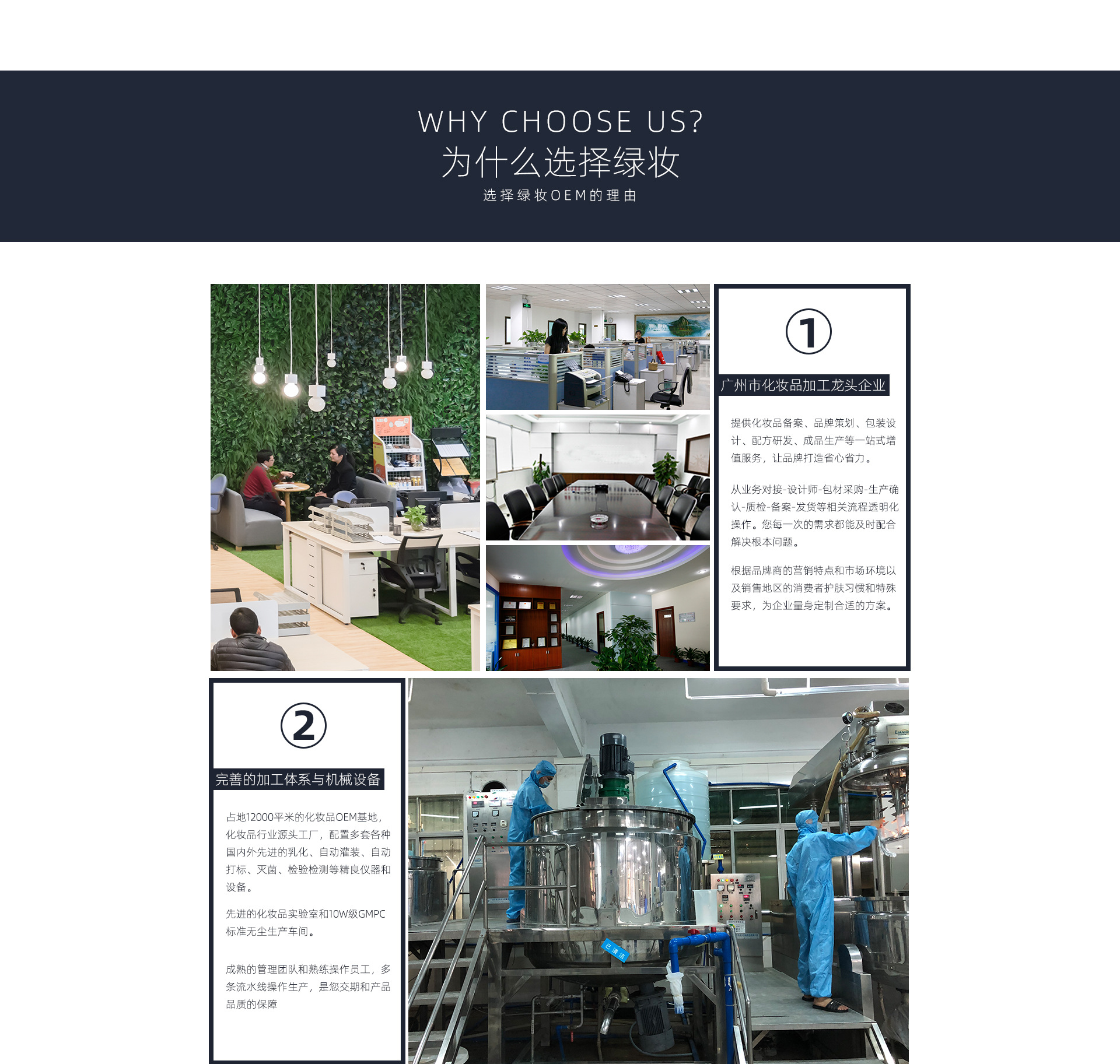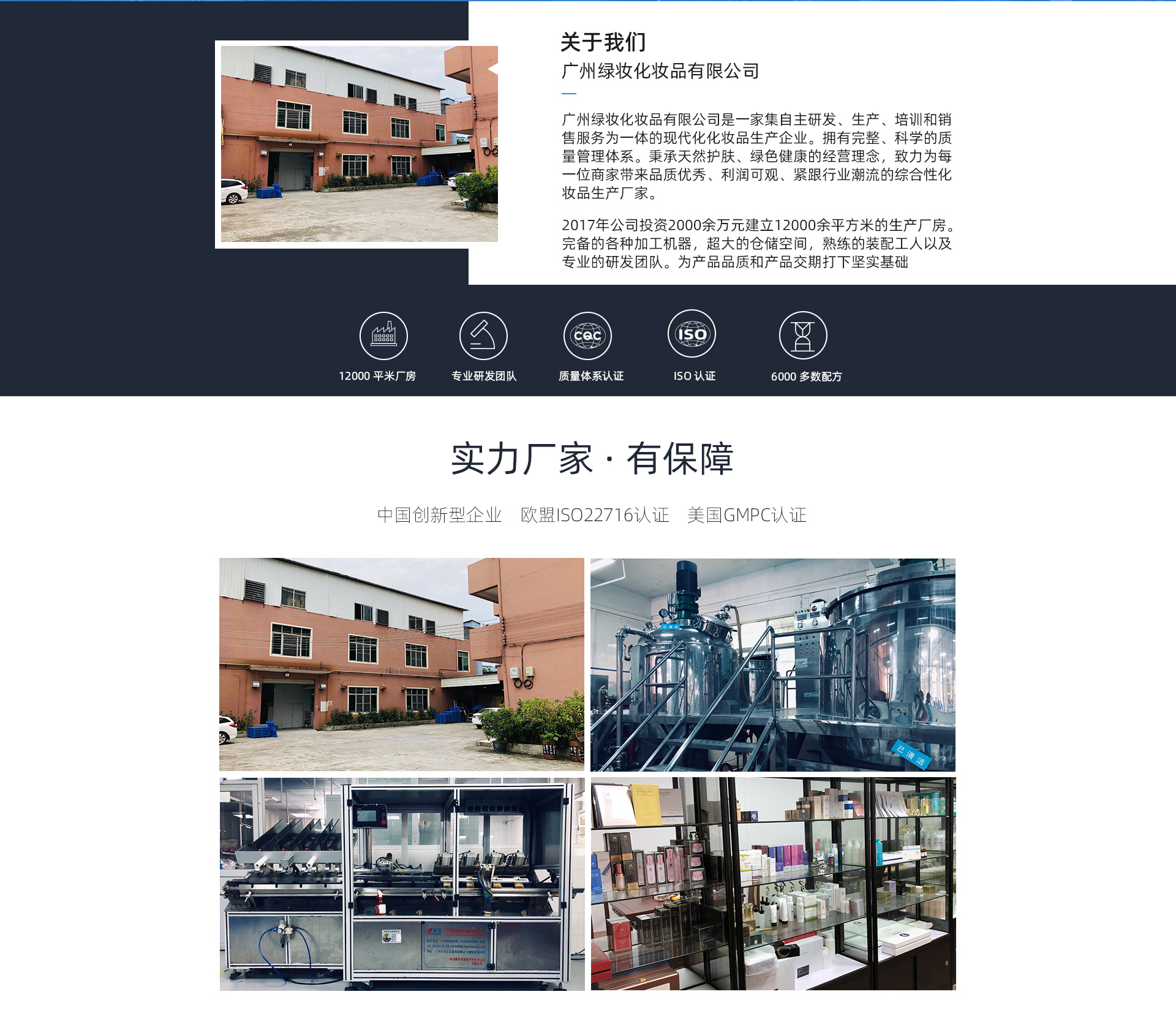 廣州綠妝化妝品有限公司是面膜、潔面乳、防護霜、隔離霜、爽膚水、小安瓶精華、原液等產品,專業為國內外護膚品牌及淘寶、天貓、微商等線上線下客戶打造爆款及流通品類護膚品、國妝特字類消字號等產品的貼牌、研發、生產、備案等,我廠積累豐富成熟的配方,滿足客戶的各類產品特性、功效等質量要求,專業生產加工的公司,擁有完整、科學的質量管理體系。廣州綠妝化妝品有限公司的誠信、實力和產品質量獲得業界的認可。歡迎各界朋友蒞臨參觀、指導和業務洽談。