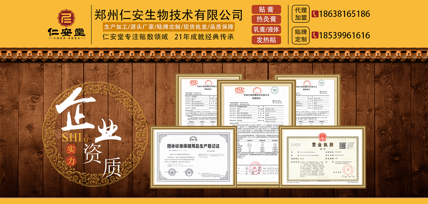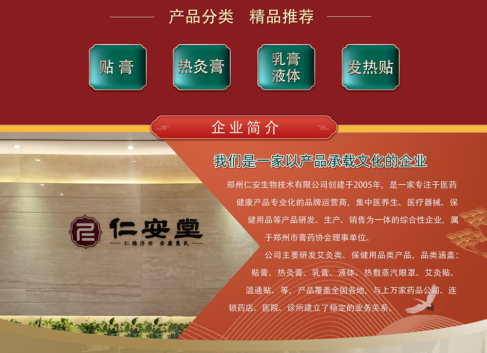 公司成立至今與兄弟企業(yè)鄭州仁安堂醫(yī)藥科技有限公司共同打造了數(shù)款暢銷(xiāo)貼敷類(lèi)產(chǎn)品,如“七毒活骨貼”、“五毒火龍貼”、“熱灸膏”、“頸肩腰腿痛保健膏”“艾灸貼”、“熱敷蒸汽眼罩”等,注冊(cè)申請(qǐng)自有商標(biāo)數(shù)十個(gè)。