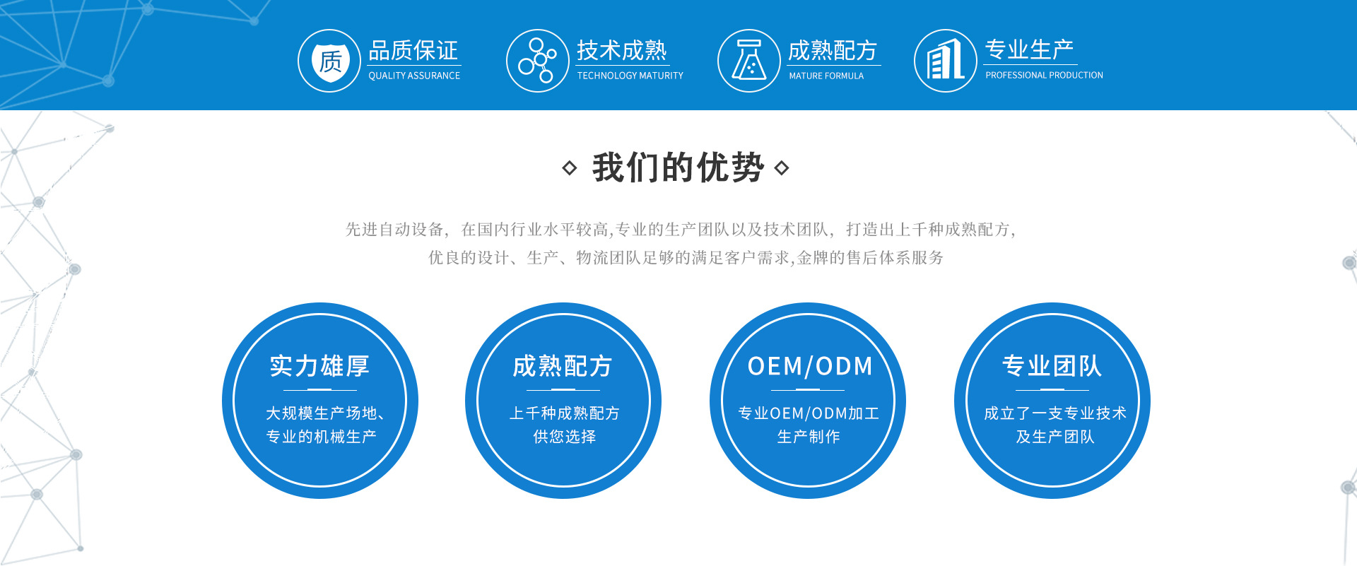 廣州愛(ài)戴化妝品有限公司是一家技術(shù)裝備先進(jìn),管理規(guī)范到位,環(huán)境保護(hù)嚴(yán)格,生產(chǎn)設(shè)備的自動(dòng)化的加工基地。公司擁有10萬(wàn)級(jí)的空氣凈化車間提供了高清潔的生產(chǎn)環(huán)境。配有先進(jìn)的生產(chǎn)設(shè)備和檢測(cè)儀器,擁有一批具有多年實(shí)踐經(jīng)驗(yàn)從事化學(xué)工程研究的高級(jí)技術(shù)人才,開(kāi)發(fā)出上千種高質(zhì)量的成熟配方,能全面滿足市場(chǎng)的各種需求