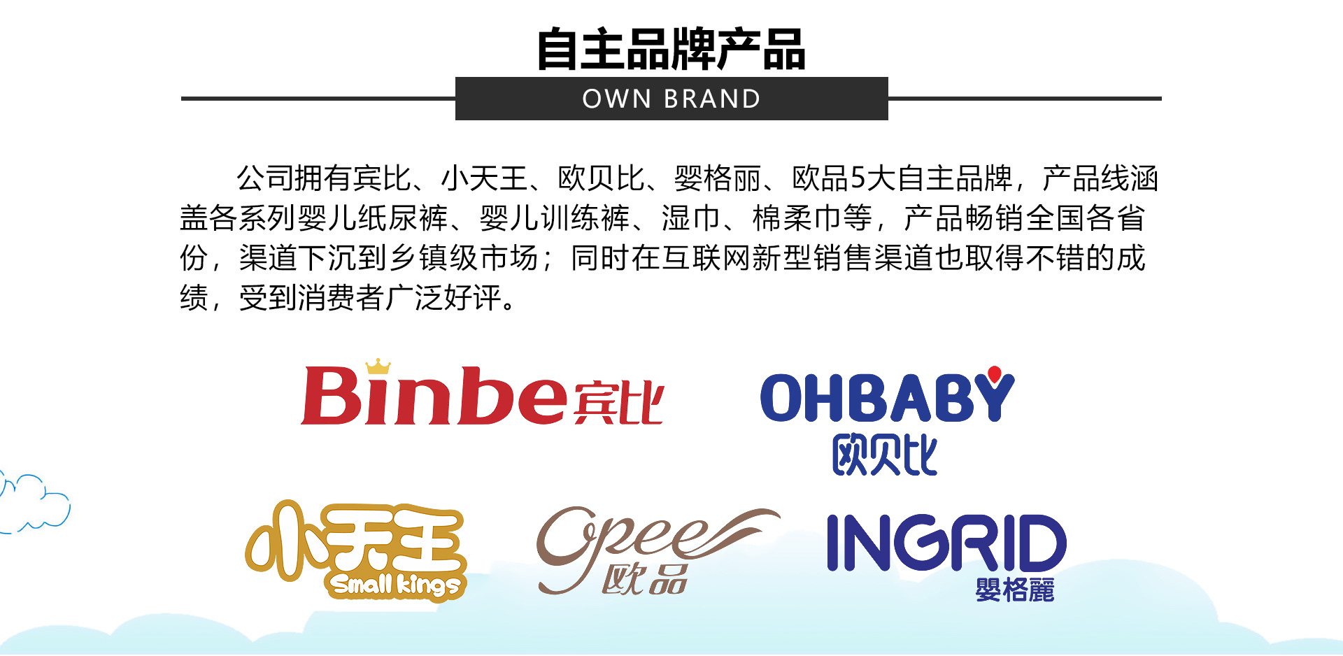 歐比護理進入衛品行業,強勢打破市場格局,產品涉及嬰兒紙尿褲、訓練褲、尿片、各類衛生濕巾等 護理用品。目前,企業旗下生產逾百款產品,享譽國內市場,產品遠銷海內外多個國家。