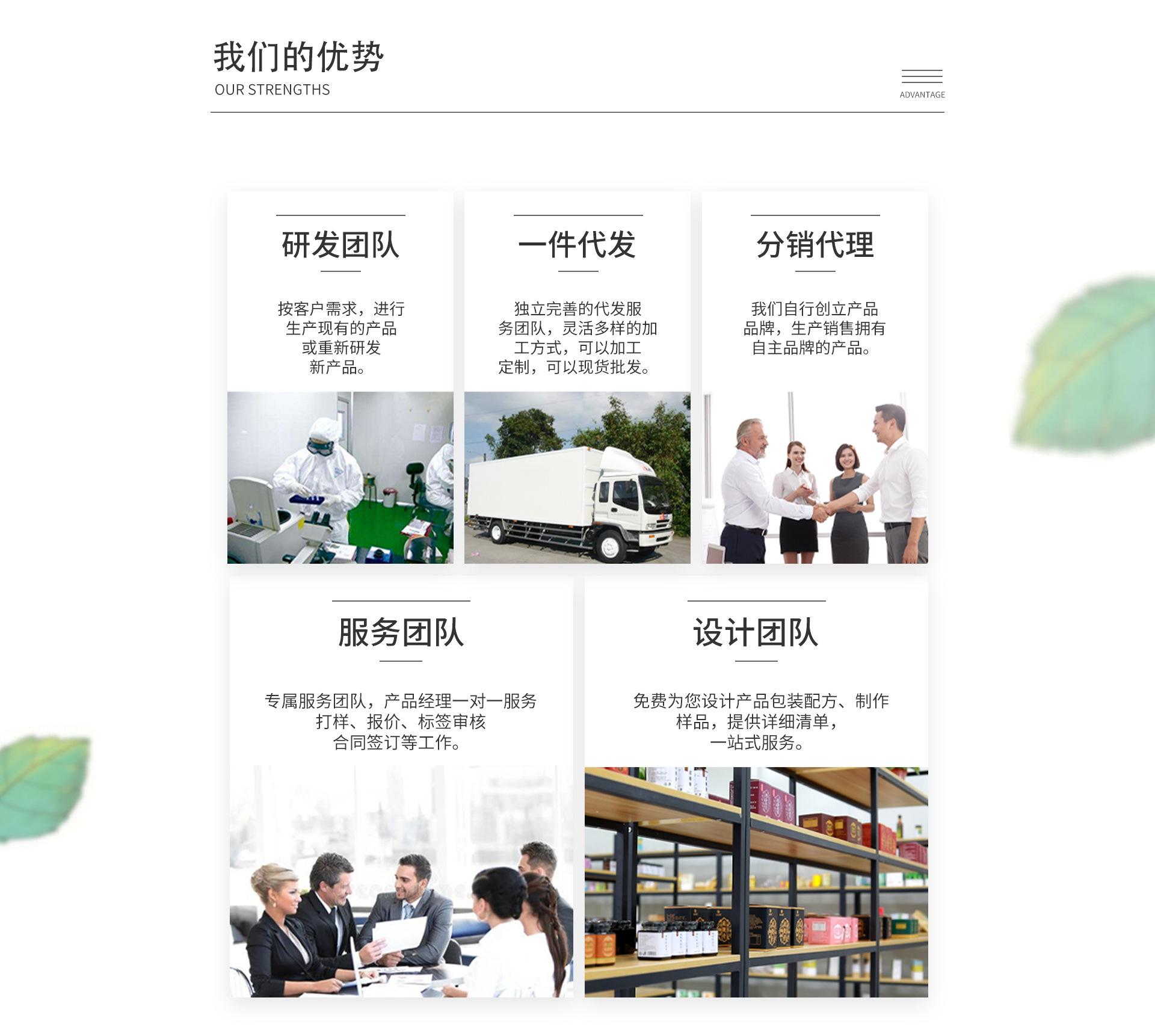 安徽清心湖畔生物科技有限責任公司成立于2018年,是食療養生研發基地,是一家專業代工貼牌的實力工廠,現有成熟產品有糕點類(九蒸九曬黑芝麻丸、芝麻丸)膏方類(秋梨膏、伏濕膏等),代用茶類(紅豆薏米茶 五寶茶等)方便食品類(山藥猴菇粉 黑芝麻核桃 黑豆粉等)。 安徽清心湖畔生物科技有限責任公司成立于2018年,是食療養生研發基地,是一家專業代工貼牌的實力工廠,現有成熟產品有糕點類(九蒸九曬黑芝麻丸、芝麻丸)膏方類(秋梨膏、伏濕膏等),代用茶類(紅豆薏米茶 五寶茶等)方便食品類(山藥猴菇粉 黑芝麻核桃 黑豆粉等)。 愿景:成為向全世界提供食療養生代工的全球標桿企業 使命:把安徽清心湖畔生物科技建成為全中國乃至全世界最成功的食療養生代工廠 目標:成為全世界最優秀的食療養生品牌服務者