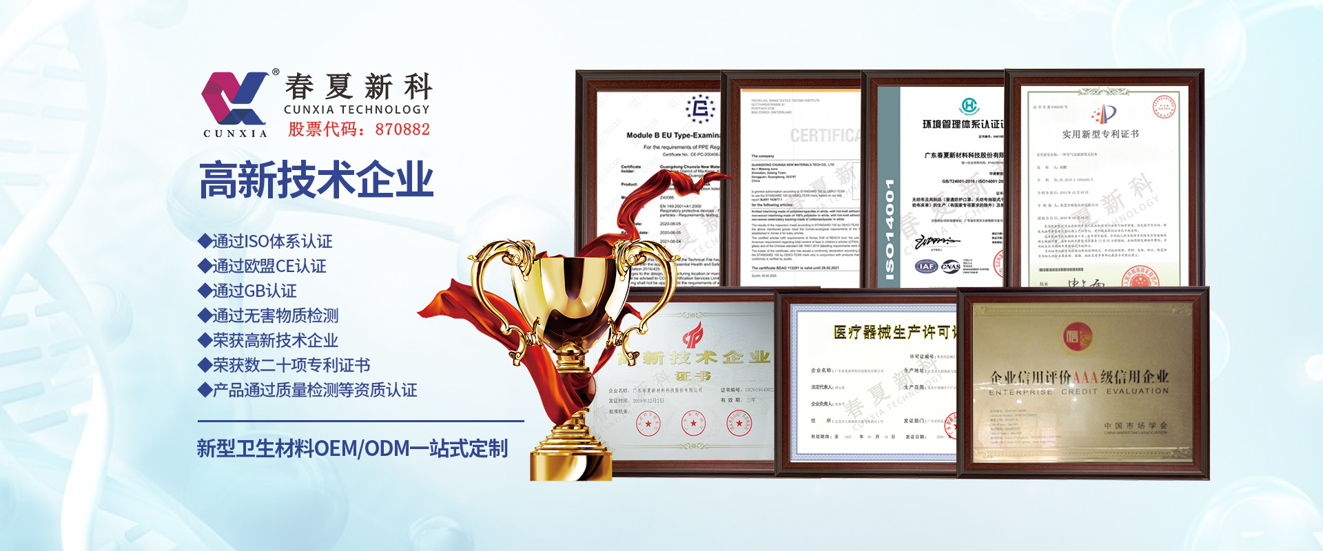 廣東春夏新材料科技股份有限公司是一家研發(fā)、生產(chǎn)、銷售無紡新材料及無紡制品為一體的上市公司。股票代碼:870882。并獲得國家高新技術(shù)企業(yè)證書,廠房占地面積約60000平方米。新材料研發(fā)有熱風(fēng)、熱軋、濕法全棉、紡粘、針刺、水刺、浸漬、網(wǎng)膜、水溶等9種新工藝技術(shù)無紡布,配備15種不同工藝制品的生產(chǎn)車間。 產(chǎn)品廣泛用于生活日用品、美容酒店護(hù)理、醫(yī)療、環(huán)保過濾、汽車內(nèi)飾、衛(wèi)生防護(hù)、工業(yè)清潔等一次性用品。公司產(chǎn)品已通過國際最高OEKO-TEX認(rèn)證和ISO9001質(zhì)量體系認(rèn)證及ISO14001環(huán)境體系認(rèn)證,產(chǎn)品遠(yuǎn)銷歐美、中東、東南亞、南美等100多個(gè)國家。