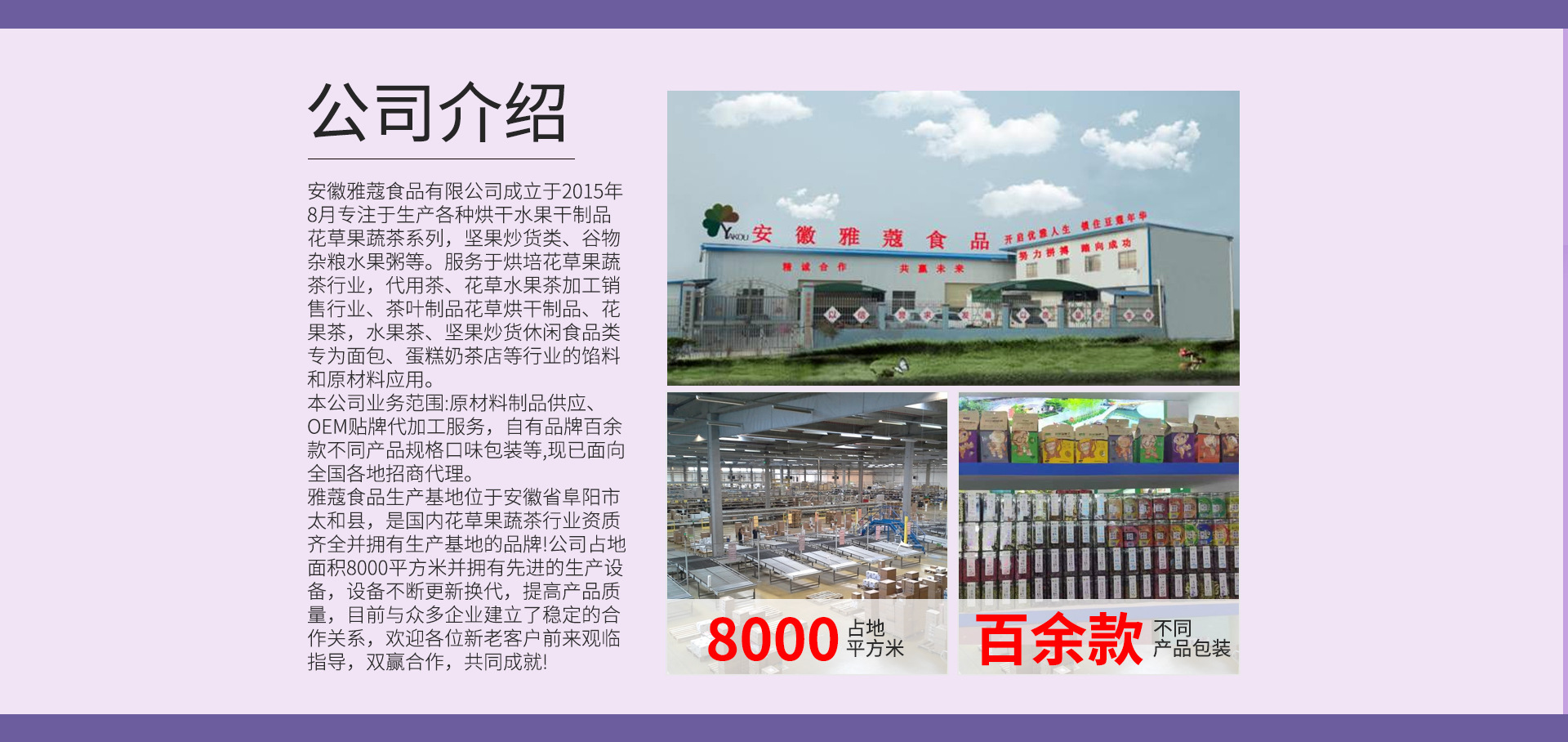 安徽雅蔻食品有限公司 成立于2015年8月 專注于生產各種 烘干水果干制品 花草果蔬茶調味茶系列,烘炒類-堅果 果干 谷物 雜糧水果粥 制品。 服務于烘培,花草果蔬茶行業,代用茶 花草水果茶加工銷售行業 茶葉制品 花草烘干制品 花果茶,水果茶 堅果炒貨休閑食品類,專為 面包 蛋糕 奶茶店 等行業的餡料和原材料應用。 本公司業務范圍:原材料制品供應 OEM 貼牌代加工服務, 自有品牌百余款不同產品規格口味包裝等,現已面向全國各地招商代理。 雅蔻食品生產基地位于 安徽省阜陽市 太和縣,是國內花草果蔬茶行業 資質齊全并擁有生產基地的品牌!公司占地面積1萬平方米 并擁有先進的生產設備,設備不斷更新換代 提高產品質量 目前與眾多企業建立了穩定的合作關系,歡迎各位新老客戶前來觀臨指導 雙贏合作 共同成成!