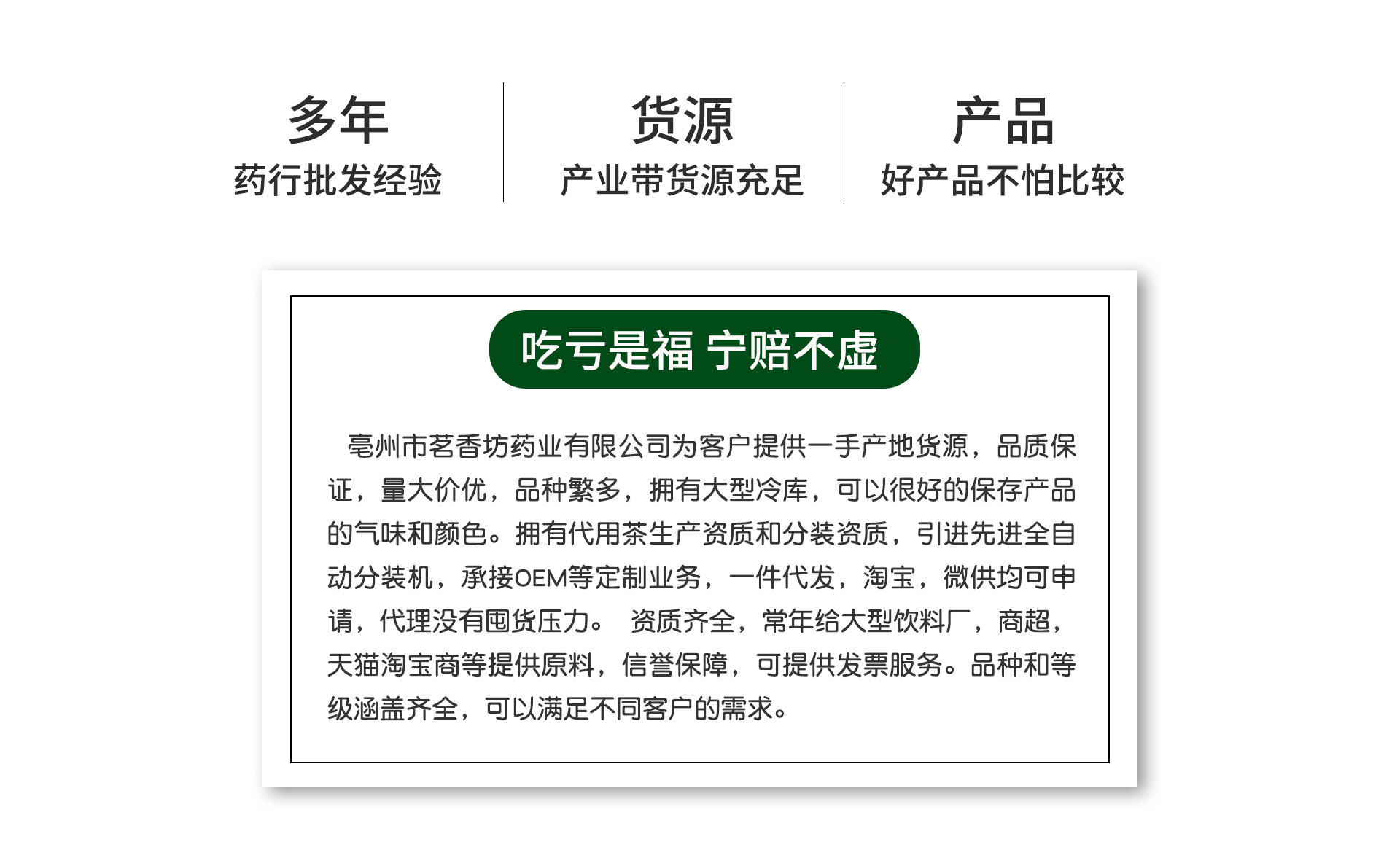亳州市茗香坊藥業(yè)有限公司 經(jīng)銷批發(fā)的金花茶、檸檬干、枸杞茶、棗干、苦蕎 棗干 羅布麻 金銀花 玫瑰花茶 菊花茶 暢銷消費(fèi)者市場(chǎng),在消費(fèi)者當(dāng)中享有較高的地位,公司與多家零售商和代理商建立了長(zhǎng)期穩(wěn)定的合作關(guān)系。 公司實(shí)力雄厚,重信用、守合同、保證產(chǎn)品質(zhì)量,以多品種經(jīng)營(yíng)特色和薄利多銷的原則,贏得了廣大客戶的信任。
