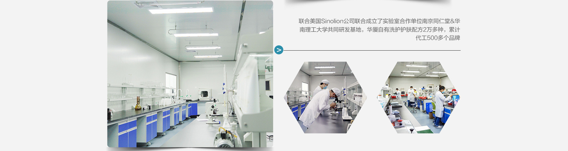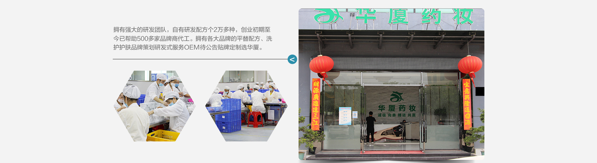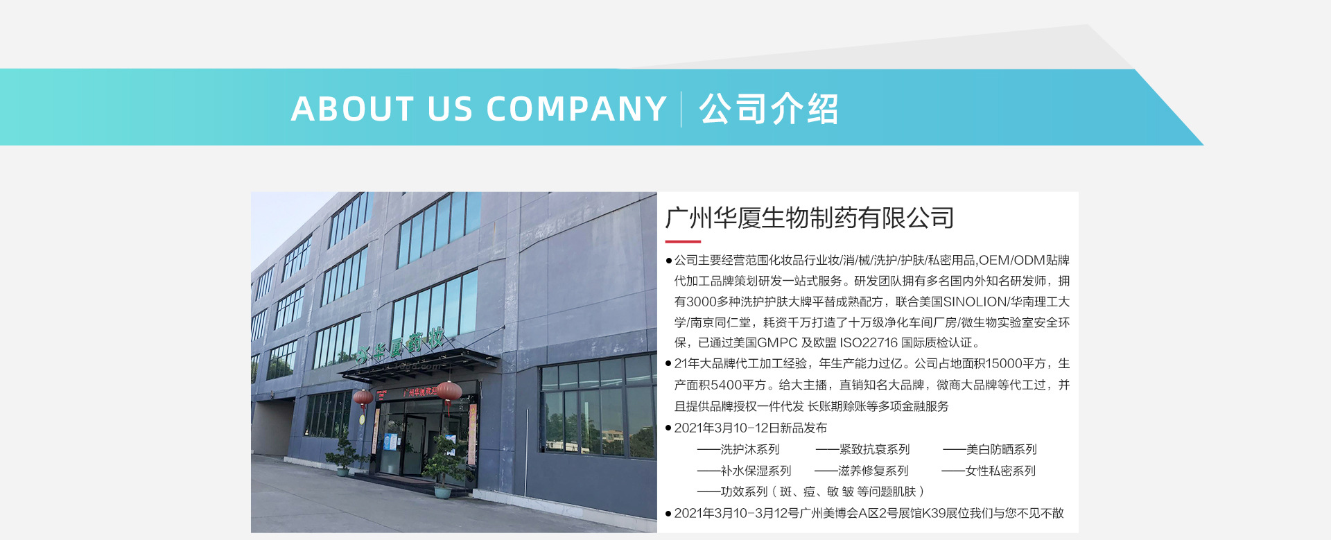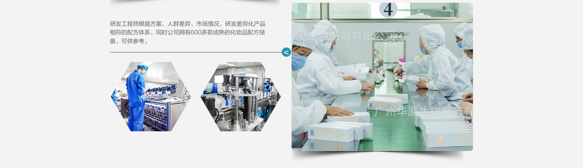 廣州華廈生物制藥有限公司是一家集日化洗滌、化妝護膚、消字號一體化等產品專業生產的大型綜合加工廠,擁有完整、科學的質量管理體系。 生產總部設在廣州白云區,園區占地面積達56畝。本廠非常注重生態環境與衛生健康標準;工廠采用目前化妝品高標準的10萬級GMPC凈化車間,零污染化設計,具有生產眼部和嬰幼產品資質對品質的注重是我們一直以來堅持的原則擁有完整、科學的質量管理體系。 乳化設備13臺,其中六噸真空乳化鍋3個;兩噸液洗鍋3個;一噸真空乳化鍋和液洗鍋各一個500kg真空鍋3個;100kg真空鍋3個;十噸靜置儲罐6個;一噸靜置儲罐六是個;美國反滲透RO膜每小時可產6噸二級凈水機一臺;流水線16條;全自動煙包機6臺;日產量可以達到100噸洗護或200噸面膜的大型工廠。 本廠一向注重產品 品質,擁有國內外知名醫藥博士工程師共同研發定制新產品,以提高產品質量和企業競爭力。