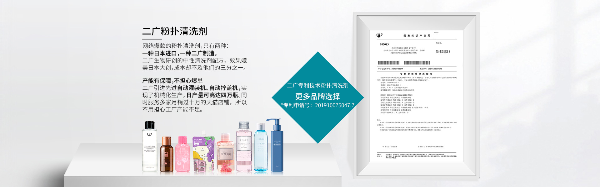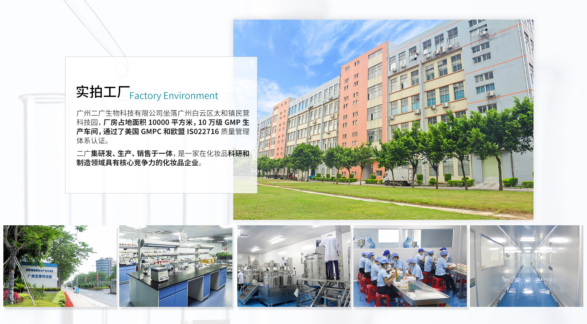 廣州二廣生物科技有限公司坐落廣州白云區太和鎮民營科技園,廠房占地面積10000平方米,10萬級GMP生產車間,通過了美國GMPC和歐盟ISO022716質量管理體系認證。二廣集研發、生產、銷售于一體,是一家在化妝品科研和制造領域具有核心競爭力的化妝品企業。
