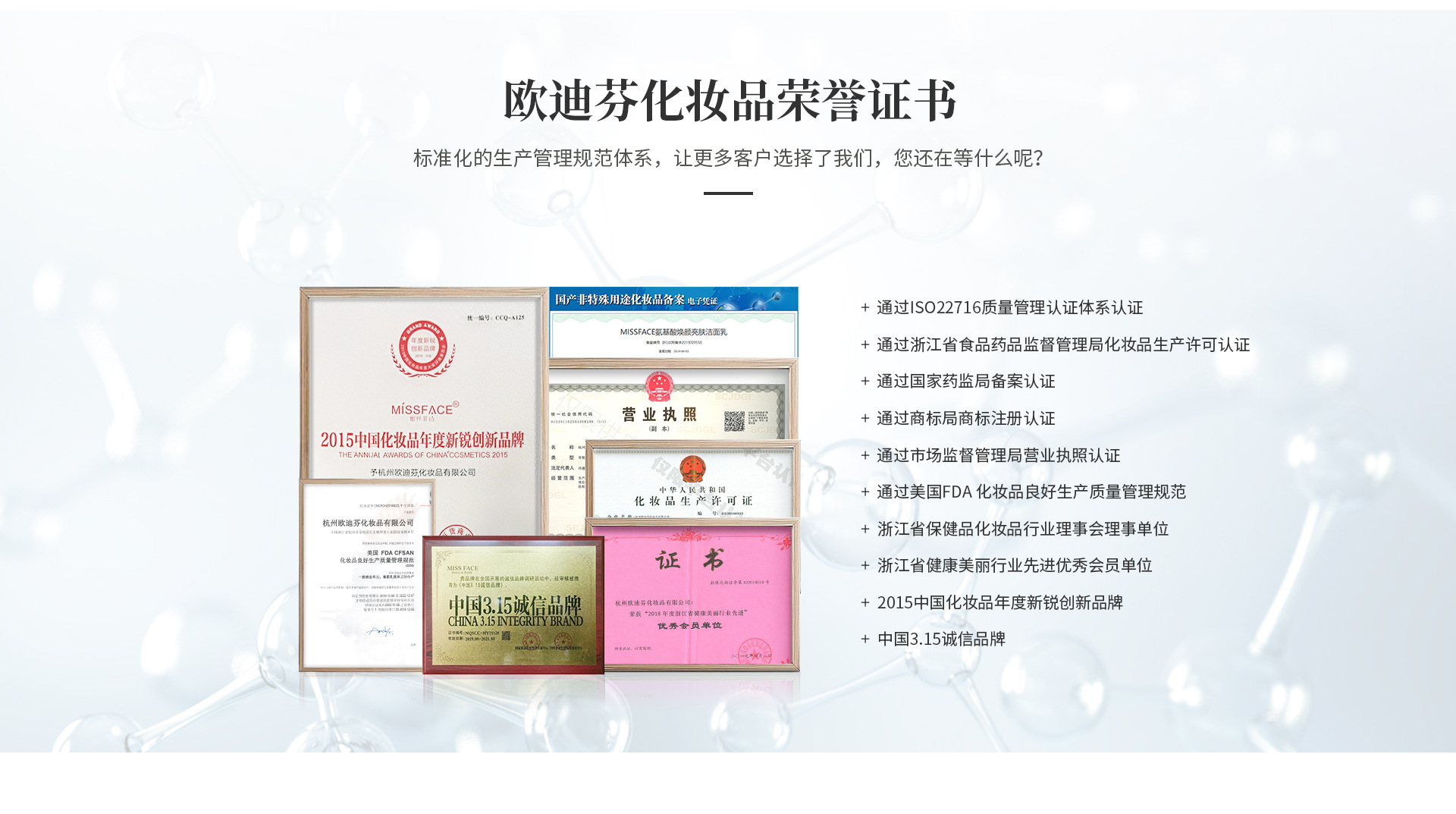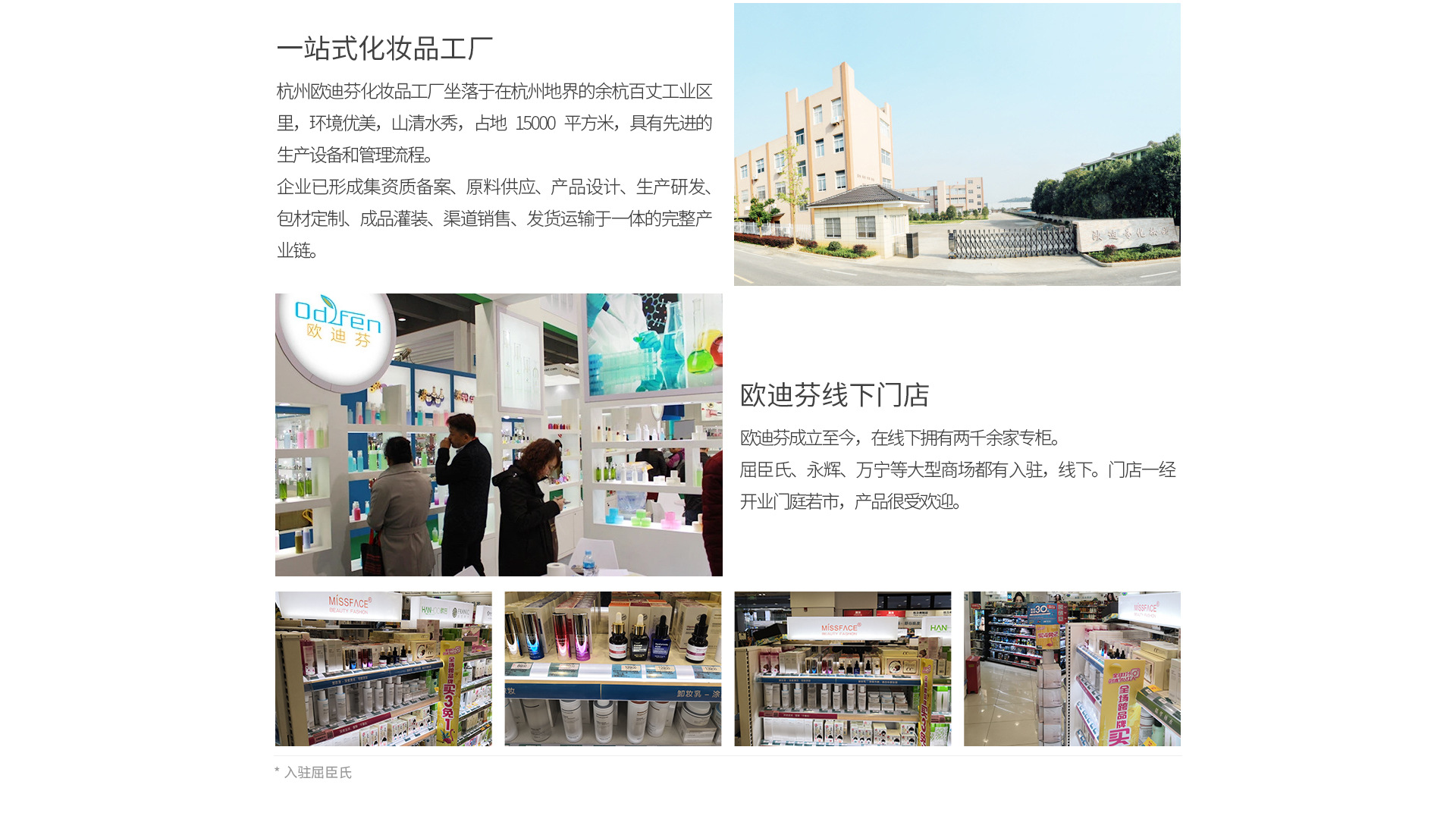 杭州歐迪芬化妝品工廠坐落于在杭州地界的余杭百丈工業區里,環境優美,山清水秀,占地15000平方米。擁有十萬級凈化無塵車間,工廠的生產制作間生產環境完全按照準藥品的生產標準GMPC的高規格來建造,確保了空氣潔凈、環境衛生、布局合理、物流暢通、生產安全 工廠具有先進的生產設備和管理流程,每一位員工遵守嚴肅思考,嚴密操作的生產標語,確保能讓每一個產品都能達到適合東方女性肌膚特點的標準。 出來的每一個產品都是經過每位員工的辛勤勞作、精準檢測而來的,認真執行“不接受不良品,不生產不良品,不放行不良品”的生產態度。 歐迪芬專注以食養膚的理念,遵循現代人崇尚自然,回歸自然的護膚品牌。 歐迪芬認為“由內而外流露出的肌膚健康之美”是我們的追求,在發展過程中始終堅持美麗與健康并存的理念,以客戶為導向,堅持以天然、安全的配方成分“打動”肌膚。貼心服務每一位顧客,在高層次上打造品牌持久影響力。