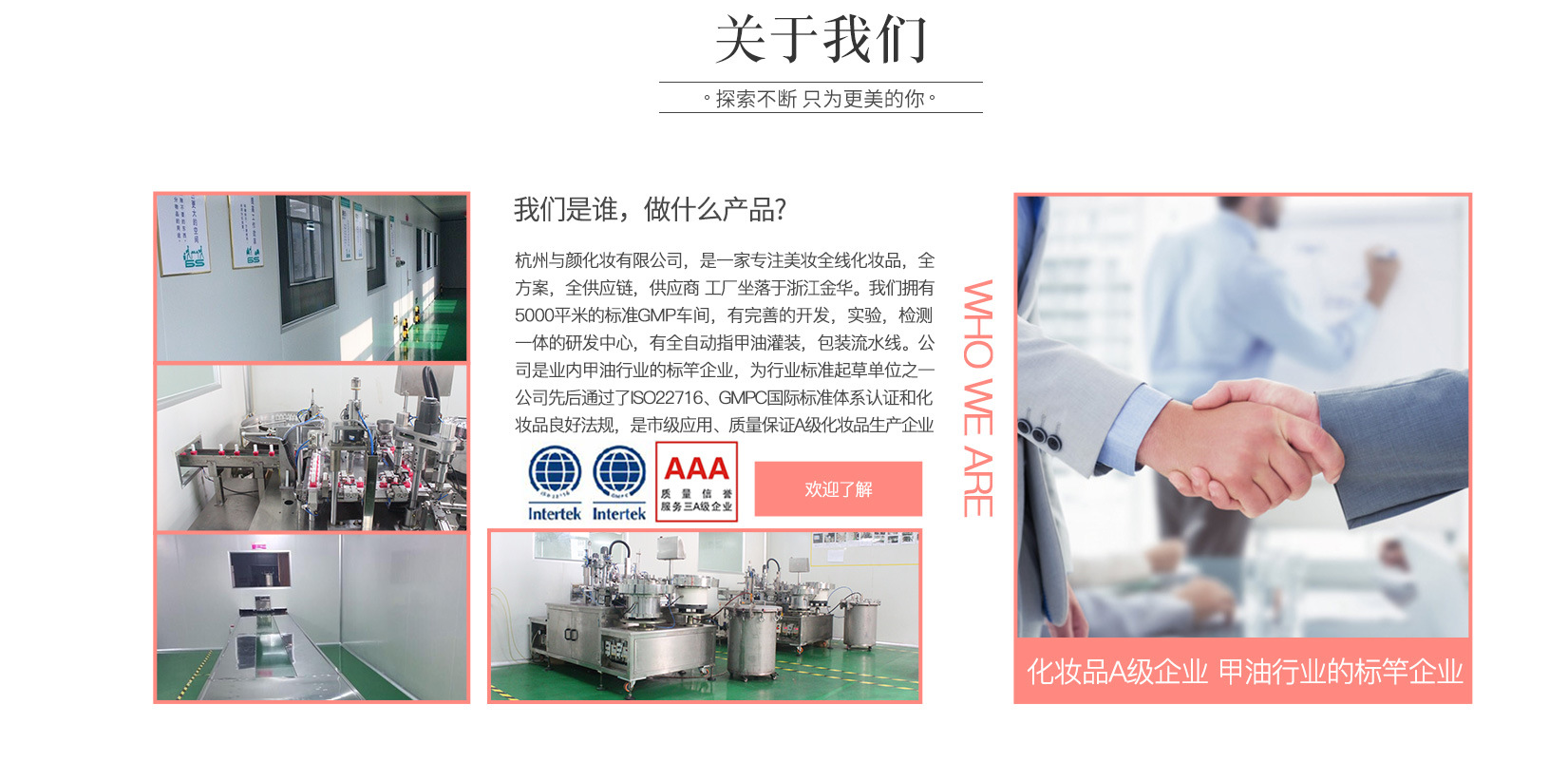 杭州與顏化妝品有限公司是一家專注指甲類全線化妝品,全方案,全供應鏈供應商(指甲油、UV膠、功能指甲油,指甲套裝, 指甲沾粉),工廠坐落于浙江金華。 我們擁有5000平米的標準GMP車間,有完善的開發,實驗,檢測一體的研發中心,有全自動指甲油灌裝,包裝流水線。公司是業內甲油行業的標竿企業,為行業標準起草單位之一,公司先后通過了ISO22716、GMPC國際標準體系認證和化妝品良好法規,是市級應用、質量保證A級化妝品生產企業。工廠指甲油的日產量可達15萬瓶。 全球知名的指甲油原料和信息提供商FIABILA菲拉比拉,德林 ,KEKE 有深度合作關系。與SGS,ITS,BV等第三方檢測機構長期合作,我們致力于給專業線客戶提供符合歐美法規、中國法規要求和使用性能良好的甲部化妝品。解決客戶從產品研發,設計,生產,物流等全供應鏈問題。 化妝品A級企業,甲油行業的標竿企業