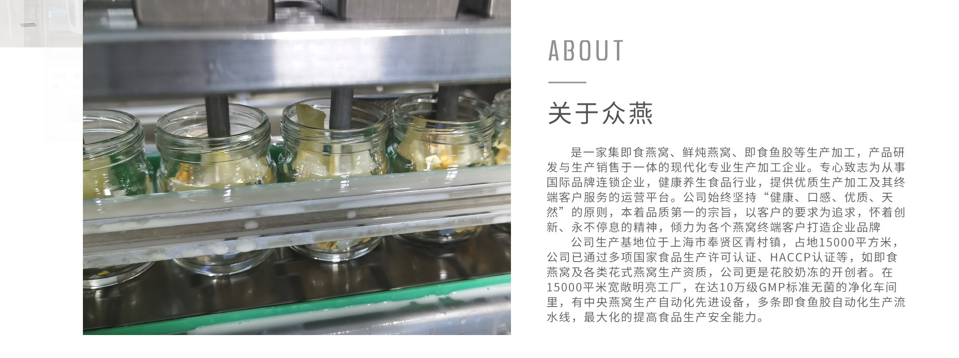 眾燕健康食品(上海)有限公司位于美麗的古鎮上海市奉賢區青村鎮人民路236號,注冊資本為1000萬人民幣,工廠專業化研發、生產及銷售即食燕窩、鮮燉燕窩、燕窩飲品、即食花膠等燕窩衍生產品,擁有良好的生產環境、先進的生產設備、精湛的技術以及完善的企業管理機制,用實力贏得了客戶的認可和信賴。 工廠占地15000平方米,配備10萬級GMP無菌的凈化車間、自動化流水線、標準的實驗室、無菌室操作室等,工廠現有員工200多人,工廠秉持“市場第一、客戶第一、服務第一”的經營理念。 工廠已經投資建設產品研發中心,繼續發揮技術領先與新產品研發優勢。除了自己擁有精銳的專業技術隊伍之外,公司還密切關注燕窩行業的頂尖技術,與國內外相關單位建立良好的合作關系,為國內燕窩行業產品研發貢獻自己的一份力量。
