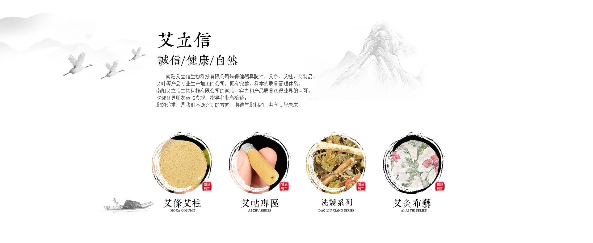 本公司主要生產艾條、艾柱、艾絨、肚臍貼、頸椎貼。膝蓋貼、舒眠貼、艾草眼貼、泡腳包等各種艾制品一條龍服務。 公司秉承“成人達己,合作共贏”的經營理念,以“利家人·利伙伴·利公司”為綱領,堅持“一幫二教三賦能”的服務宗旨,一直引領在艾草行業的前沿!