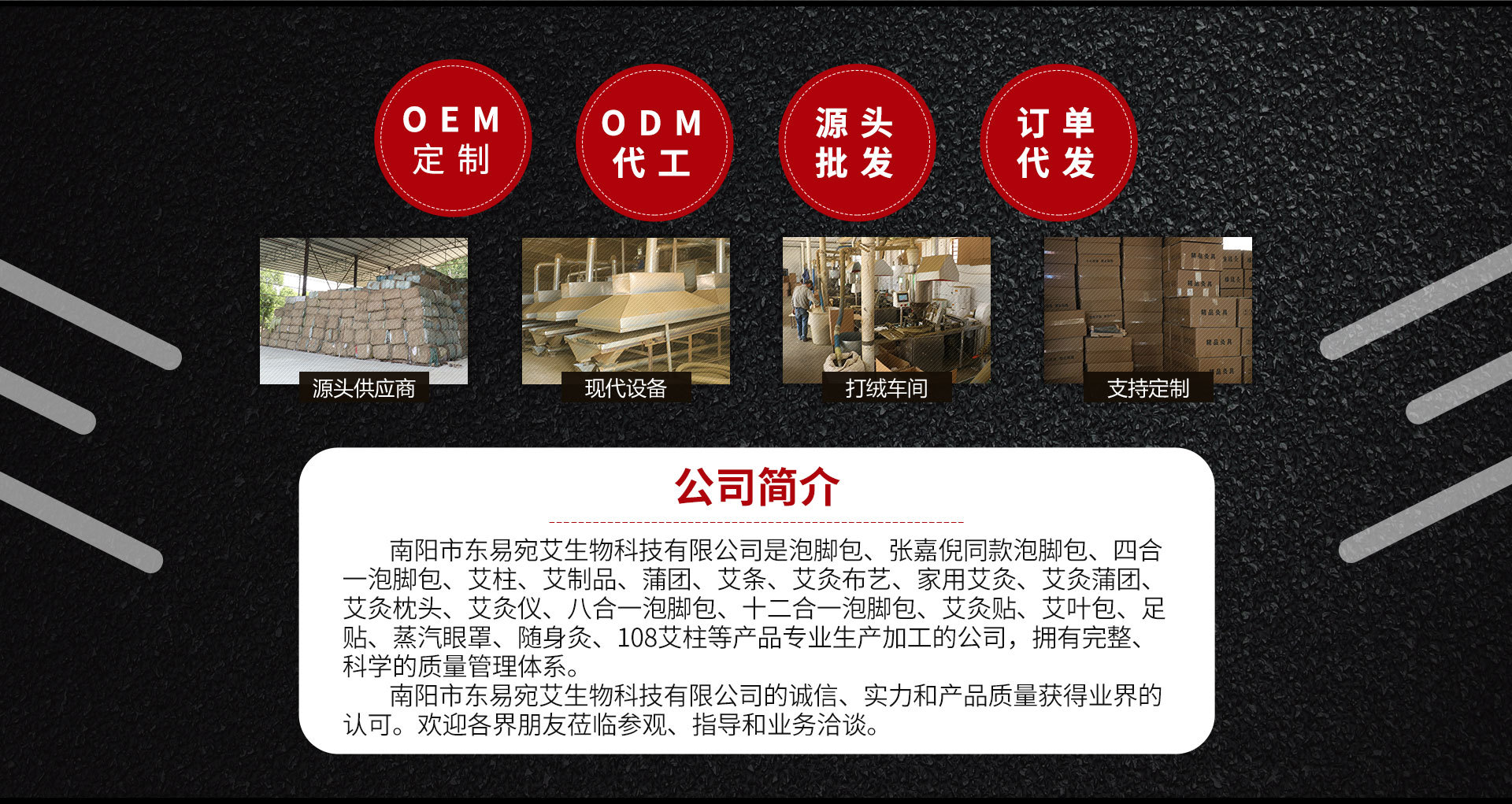 南陽市東易宛艾生物科技有限公司是泡腳包、張嘉倪同款泡腳包、四合一泡腳包、艾柱、艾制品、蒲團、艾條、艾灸布藝、家用艾灸、艾灸蒲團、艾灸枕頭、艾灸儀、八合一泡腳包、十二合一泡腳包、艾灸貼、艾葉包、足貼、蒸汽眼罩、隨身灸、108艾柱等產(chǎn)品專業(yè)生產(chǎn)加工的公司,擁有完整、科學(xué)的質(zhì)量管理體系。南陽市東易宛艾生物科技有限公司的誠信、實力和產(chǎn)品質(zhì)量獲得業(yè)界的認可。歡迎各界朋友蒞臨參觀、指導(dǎo)和業(yè)務(wù)洽談。