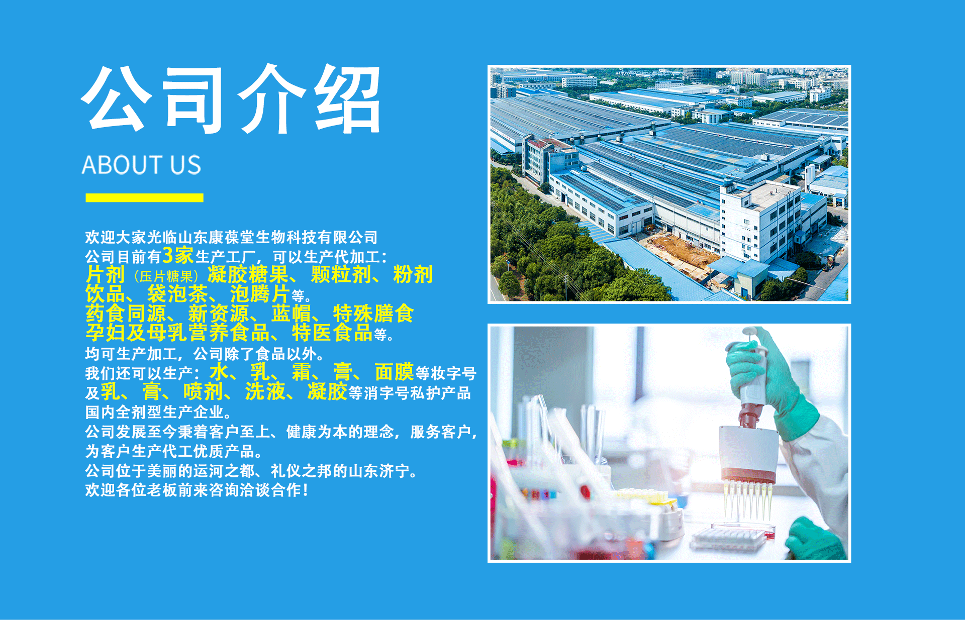 濟(jì)寧康葆堂生物科技有限公司是恒康生物醫(yī)藥集團(tuán)有限公司銷售子公司,是一家致力于研發(fā)、生產(chǎn)、銷售為一體的技術(shù)創(chuàng)新型企業(yè)。位于孔孟之鄉(xiāng)、運(yùn)河之都的山東濟(jì)寧。 公司成立以來一直專注于大健康、食品生產(chǎn)等產(chǎn)品的OEM/ODM服務(wù),秉承著發(fā)展生物醫(yī)藥技術(shù),走大健康產(chǎn)業(yè)發(fā)展的企業(yè)理念。重視產(chǎn)品研發(fā)工作,擁有一支高學(xué)歷的研發(fā)隊(duì)伍,緊跟時(shí)代步伐,不斷推陳出新,滿足顧客需求,以永恒品質(zhì),健康中國(guó)的理念為基礎(chǔ),實(shí)現(xiàn)新型健康食品的綠色生產(chǎn),為人民的健康生活保駕護(hù)航!