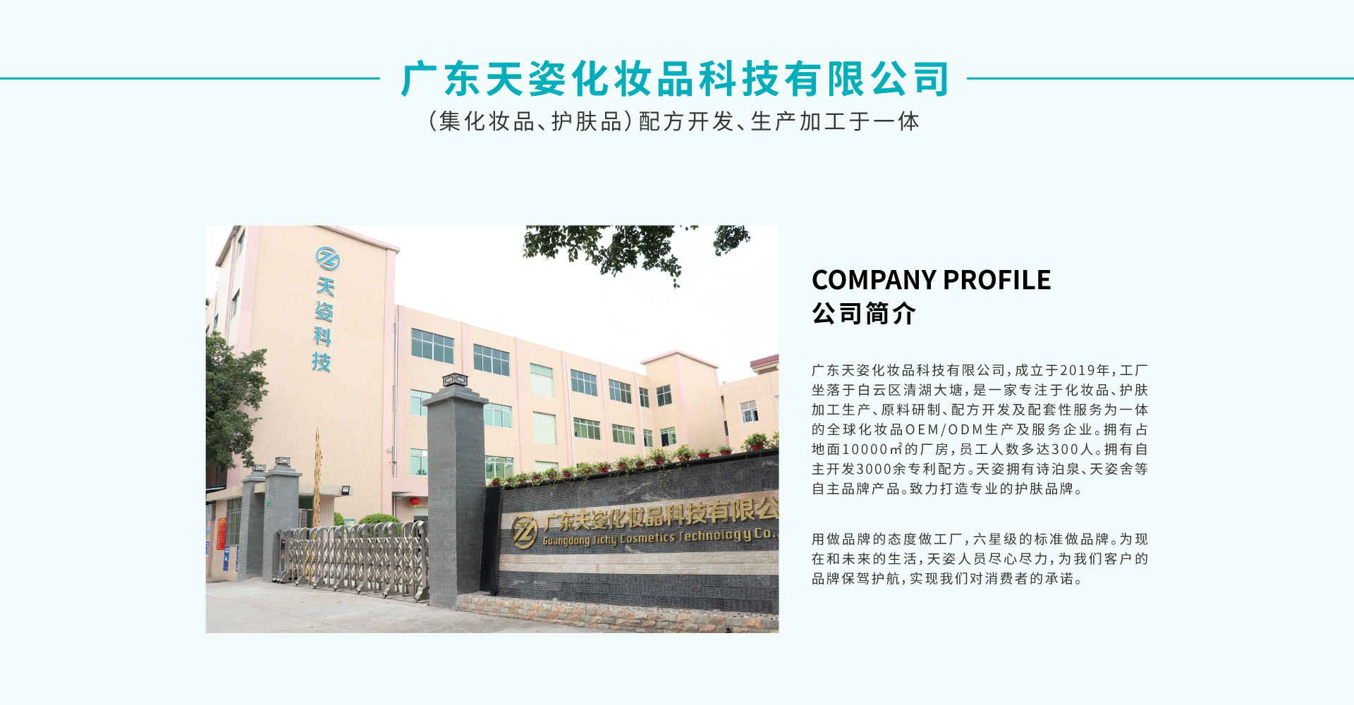 廣東天姿化妝品科技有限公司是化妝品、化妝品原料等產品專業生產加工的公司,擁有完整、科學的質量管理體系。廣東天姿化妝品科技有限公司的誠信、實力和產品質量獲得業界的認可。歡迎各界朋友蒞臨參觀、指導和業務洽談。
