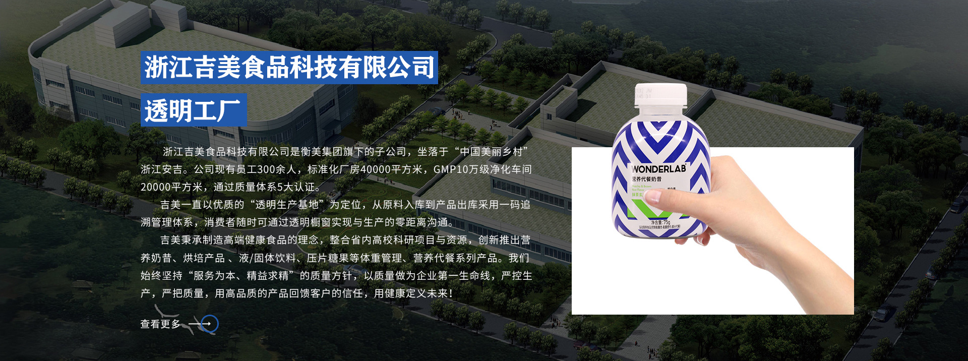 浙江吉美食品科技有限公司是衡美集團旗下的子公司,坐落于“中國美麗鄉村”浙江安吉。吉美一直以優質的“透明生產基地”為定位,從原料入庫到產品出庫采用一碼追溯管理體系,消費者隨時可通過透明櫥窗實現與生產的零距離溝通。吉美秉承制造高端健康食品的理念,整合省內高校科研項目與資源,創新推出營養奶昔、烘培產品