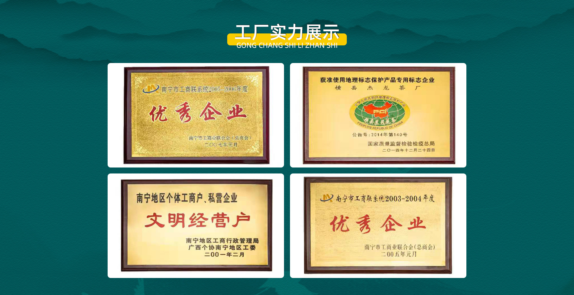 橫縣杰龍茶廠是綠茶、茉莉花茶、紅茶、普洱茶、鐵觀音等產品專業生產加工的公司,擁有完整、科學的質量管理體系。橫縣杰龍茶廠的誠信、實力和產品質量獲得業界的認可。歡迎各界朋友蒞臨參觀、指導和業務洽談。