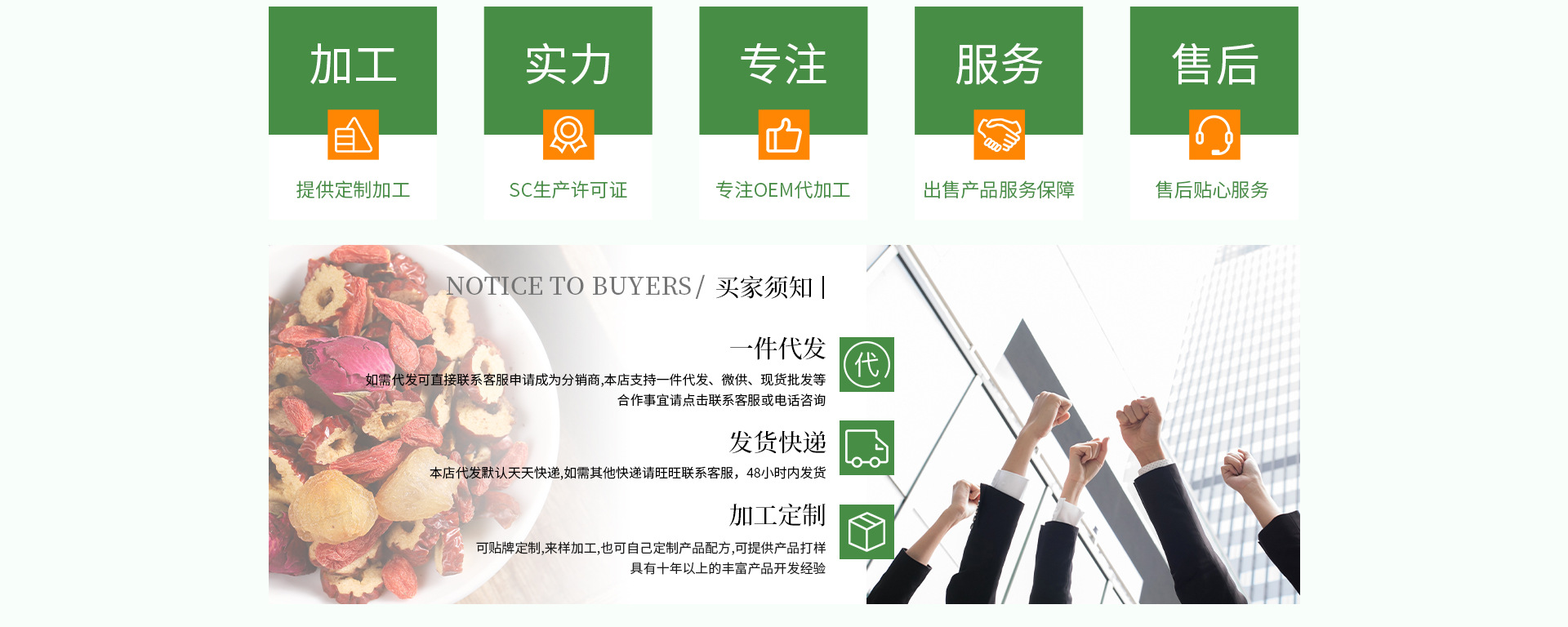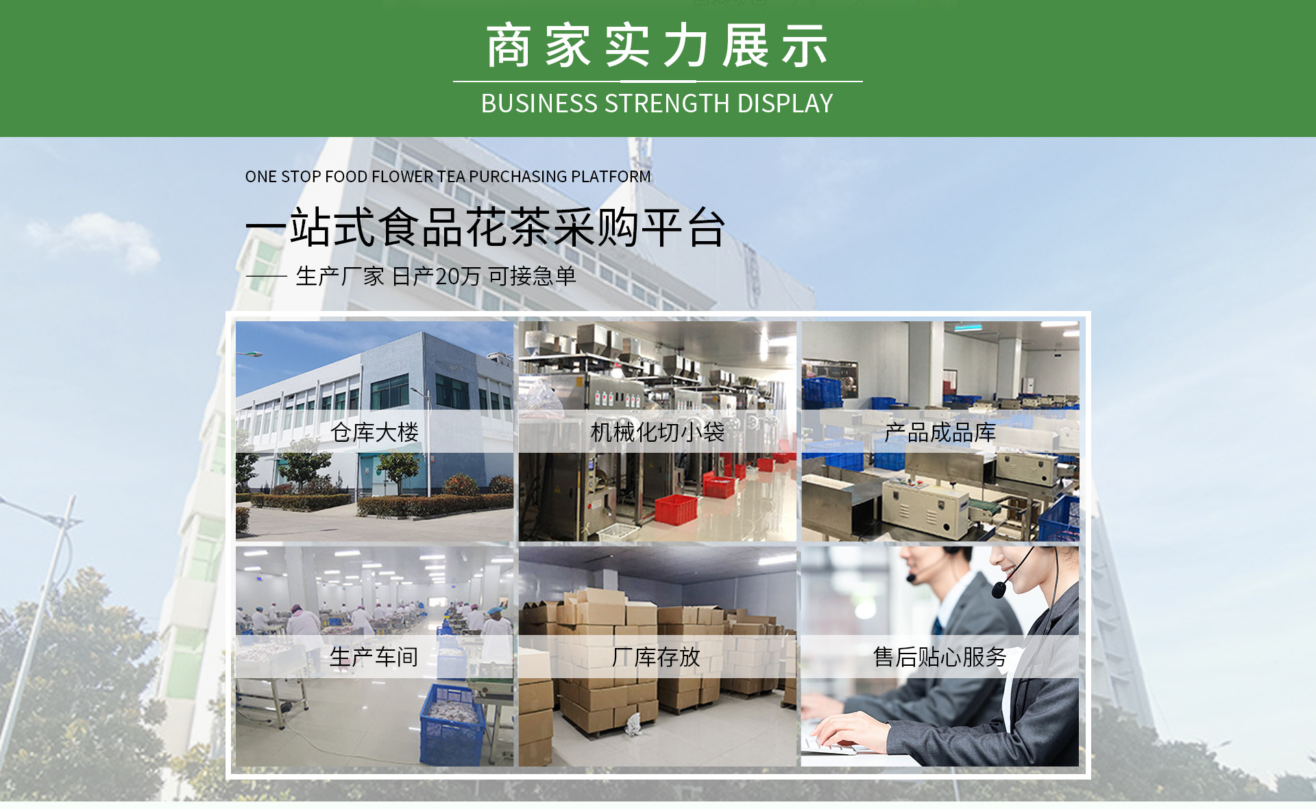 安徽浮生堂食品有限公司 主營(yíng)產(chǎn)品:各種袋泡茶產(chǎn)品(如:冬瓜荷葉茶、紅豆薏米茶、桑葉玉米須茶、三清茶等)、組合茶(如:桂圓紅棗茶、人參五寶茶、羅漢果胖大海菊花茶、等)、單品茶(如:枸杞子、黑枸杞、桂圓干、棗干、胎菊、玫瑰花等)等各種花茶的OEM貼牌代工、來(lái)料代工、可按客戶要求包裝定制、產(chǎn)品配料定制加工生產(chǎn)。(注:本公司資質(zhì)齊全、質(zhì)優(yōu)價(jià)低) 本公司占地面積兩千余平,擁有10條袋泡茶和5條組合茶生產(chǎn)線,日出貨量達(dá)10萬(wàn)袋/盒,保障急速出貨,大限度的為你節(jié)約產(chǎn)品等待時(shí)間,提高產(chǎn)品的訂單轉(zhuǎn)化量。 聯(lián)系方式 公司座機(jī):0558-5016666 朱經(jīng)理:18256789690 24小時(shí)在線,歡迎隨時(shí)咨詢聯(lián)系。