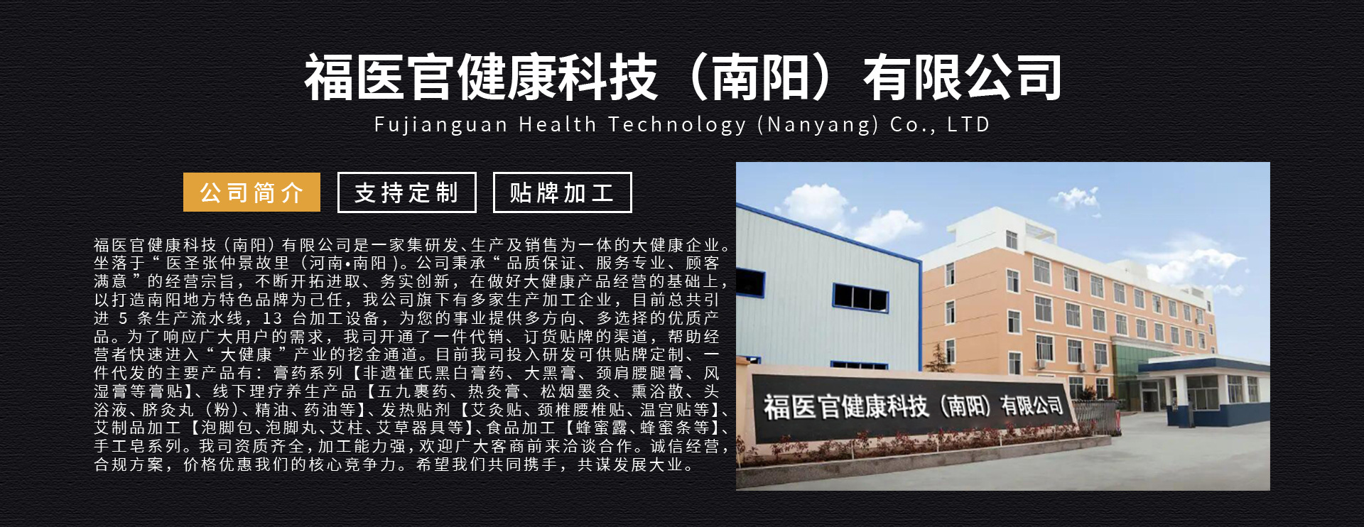 福醫(yī)官健康科技(南陽(yáng))有限公司是一家集研發(fā)、生產(chǎn)及 銷售為一體的大健康企業(yè)。坐落于“醫(yī)圣張仲景故里(河南?南陽(yáng))。 公司秉承“品質(zhì)保證、服務(wù)專業(yè)、顧客滿意”的經(jīng)營(yíng)宗旨,不斷開拓進(jìn)取、務(wù)實(shí)創(chuàng)新,在做好大健康產(chǎn)品經(jīng)營(yíng)的基礎(chǔ)上,以打造南陽(yáng)地方特色品牌為己任,我公司旗下有多家生產(chǎn)加工企業(yè),目前總共引進(jìn)5條生產(chǎn)流水線,13臺(tái)加工設(shè)備,為您的事業(yè)提供多方向、多選擇的優(yōu)質(zhì)產(chǎn)品。 為了響應(yīng)廣大用戶的需求,我司開通了一件代銷、訂貨貼牌的渠道,幫助經(jīng)營(yíng)者快速進(jìn)入“大健康”產(chǎn)業(yè)的挖金通道。 目前我司投入研發(fā)可供貼牌定制、一件代發(fā)的主要產(chǎn)品有:膏藥系列【非遺崔氏黑白膏藥、大黑膏、頸肩腰腿膏、風(fēng)濕膏等膏貼】、線下理療養(yǎng)生產(chǎn)品【五九裹藥、熱灸膏、松煙墨灸、熏浴散、頭浴液、臍灸丸(粉)、精油、藥油等】、發(fā)熱貼劑【艾灸貼、頸椎腰椎貼、溫宮貼等】、艾制品加工【泡腳包、泡腳丸、艾柱、艾草器具等】
