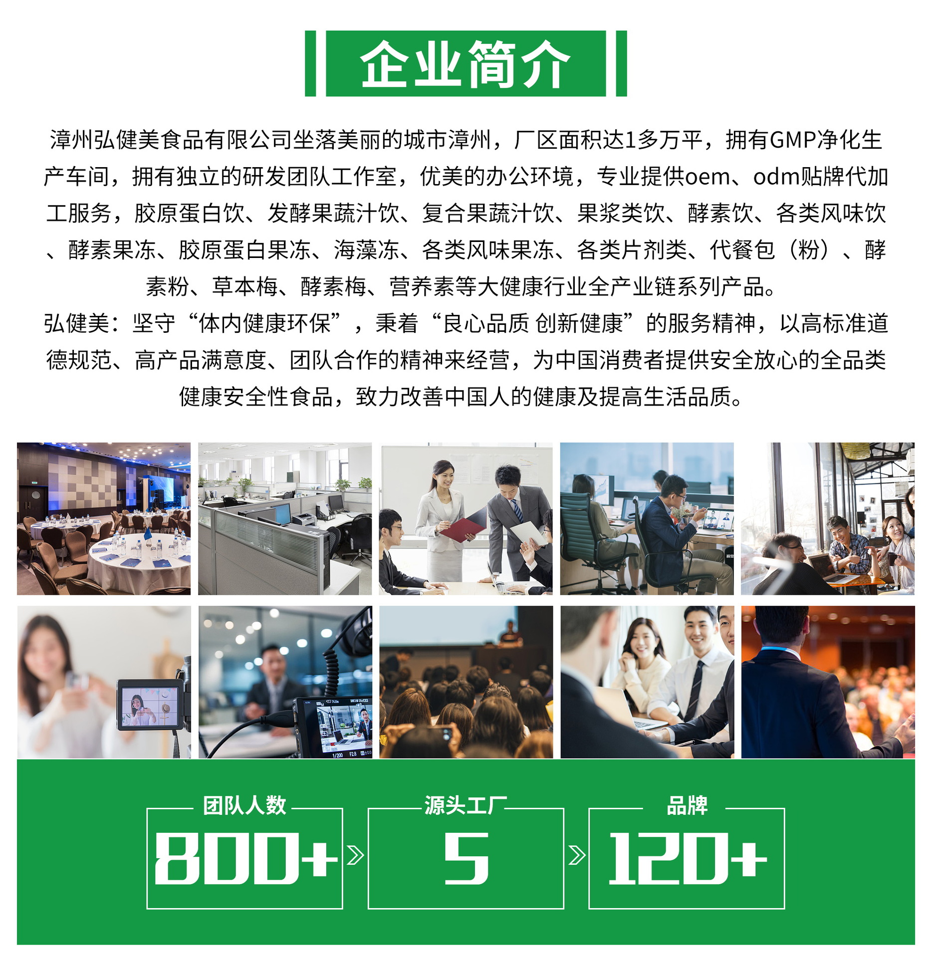 漳州弘健美食品有限公司坐落美麗的城市漳州龍文區(qū),廠區(qū)面積達1多萬平,擁有GMP凈化生產(chǎn)車間,擁有獨立的研發(fā)團隊工作室,優(yōu)美的辦公環(huán)境,專業(yè)提供oem、odm貼牌代加工服務(wù),膠原蛋白飲、發(fā)酵果蔬汁飲、復(fù)合果蔬汁飲、果漿類飲、酵素飲、各類風(fēng)味飲、酵素果凍、膠原蛋白果凍、海藻凍、各類風(fēng)味果凍、各類片劑類、代餐包(粉)、酵素粉、草本梅、酵素梅、營養(yǎng)素等大健康行業(yè)全產(chǎn)業(yè)鏈系列產(chǎn)品。