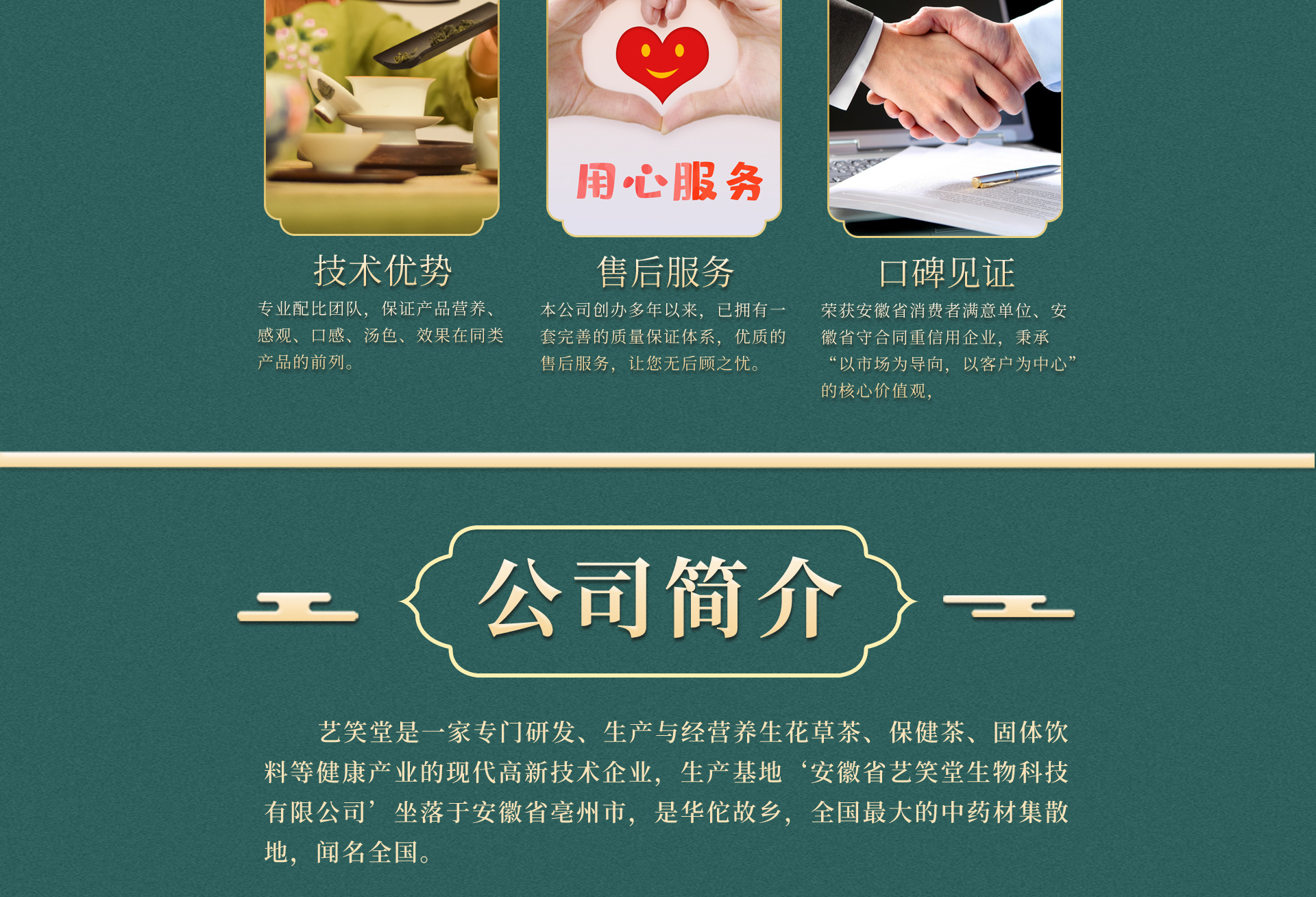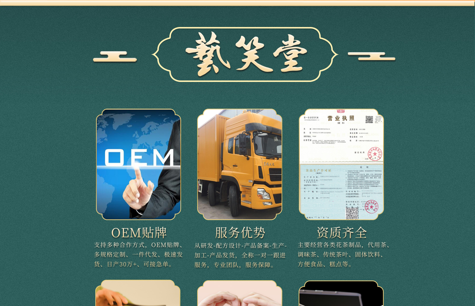 安徽省藝笑堂生物科技有限公司位于“四大藥都之首”亳州,公司面積5000平方米。公司致力于各種花茶OEM代加工、藥食同源、香料、食品等產品專業生產加工的公司 ,產品多種多樣可OEM代加工、優質的產品質量。贏得了廣大客戶的青睞,訂單紛至沓來。 安徽省藝笑堂生物科技有限公司主要生產花茶OEM代加工、藥食同源、香料、食品等產品專業生產加工的公司,擁有完整、科學的質量管理體系、 暢銷消費者市場,在消費者當中享有較高的地位,公司與多家零售商和代理商建立了長期穩定的合作關系。 我司以“質量第一、顧客至上”為宗旨,事事為客戶著想。質優價廉。 嚴抓穩定的品質、合理的價格、適時的交期和熱情的售后服務,是我司建廠到今的方針政策。熱烈歡迎客戶前來指導和參觀。 我們公司還設有專門針對淘寶用戶及零售服務小批量需求客戶的專業廠家,歡迎各位領導與我們聯系。 安徽省藝笑堂生物科技有限公司的誠信、實力和產品質量獲得業界的認可
