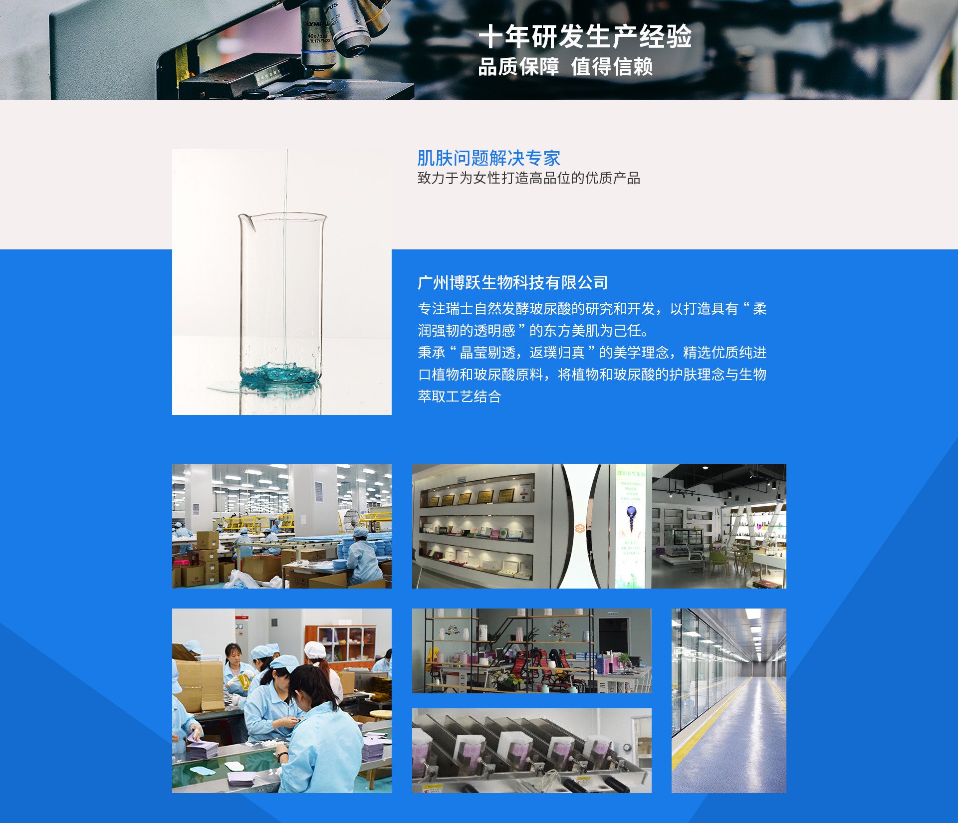 廣州博躍生物科技有限公司是一家集科研、生產、銷售、為一體的大型綜合性化妝品生產企業。廠房面積2萬平方米,10萬級GMPC醫藥級無塵凈化車間,12條產品生產線,以及來自德國、美國等地區的先進進口設備。在產品上嚴格把控生產質量、原料管理、保證產品質量穩定及可靠、可滿足客戶產能需求,更能做到讓客戶放心。 廣州瑞法生物科技有限公司于2013年引進NACO品牌研究團隊。公司八年的電商沉淀,始終如一的堅持“優品質、優服務、優形象”的“三優”原則。專注瑞士自然發酵玻尿酸的研究和開發,倡導“美,自然而然!”的美肌理念,以打造具有“柔潤強韌的透明感”的東方美肌為己任。秉承“晶瑩剔透,返璞歸真”的美學理念,精選優質純進口植物和玻尿酸原料,將植物和玻尿酸的護膚理念與生物萃取工藝結合,致力于為女性打造高品位的優質產品。