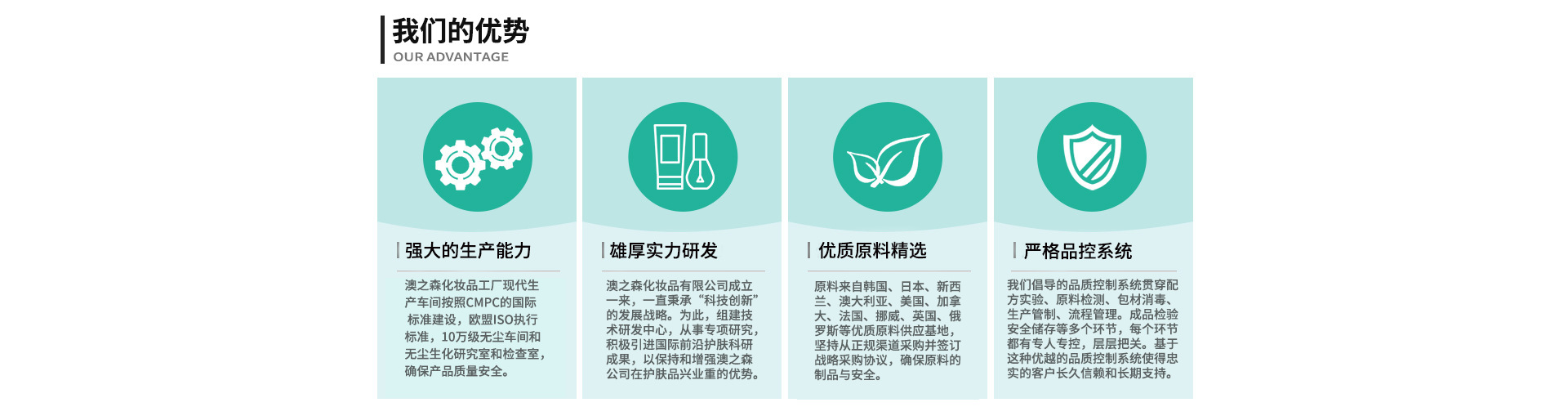 廣州澳之森生物科技有限公司化妝品OEM/ODM的專業公司附屬澳莎集團成立于2001年,工廠坐落于廣州市白云區夏茅十一社新工業區弗里歐創意園,園區環境優美,綠蔭成林,交通便利,周邊物流發達,是廣州極具理想的化妝品生產基地,50000多平方米的生產基地,近2000平方米的辦公區域,擁有10萬級無菌生產車間和多條國際先進的生產流水線,尖端的研發團隊和高科技人才更具備獨立開發配方、優化配方的卓越實力,引領了化妝品加工行業的最新趨勢,可滿足來自不同國家,不同地區的品牌的訂單生產需求。