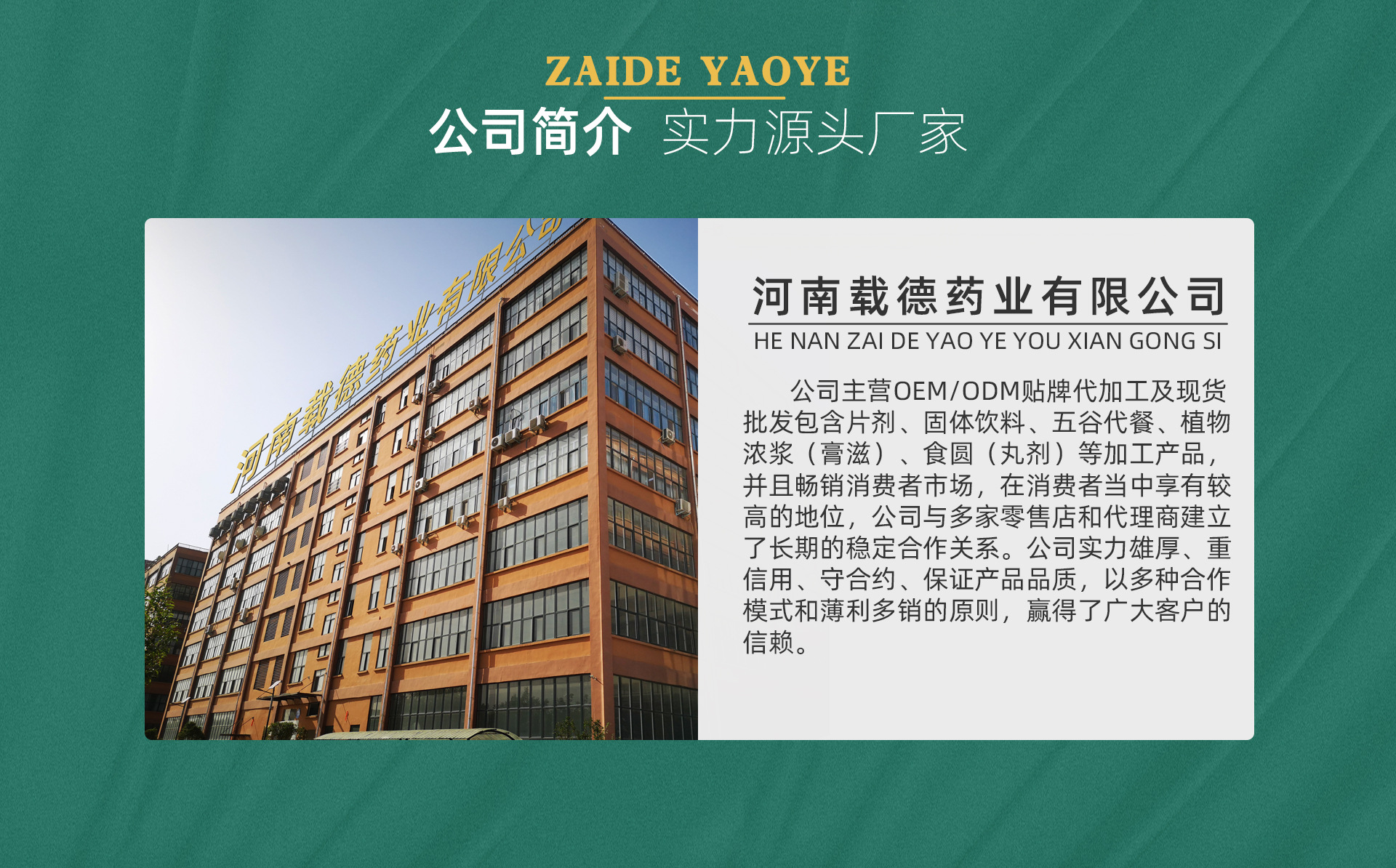 河南載德藥業有限公司是專注于壓片糖果、固體飲料、食品丸劑、膏方膏滋、五谷代餐沖調OEM ODM貼牌代工等產品的生產加工公司,擁有3000平GMP認證車間和碩士生及食品本科畢業生組成的研發團隊以及多年生產和銷售經驗。擁有完整、科學的質量管理體系。自公司成立以來,始終秉持優質、健康的生產理念,以質量贏得口碑,以效率征服市場,嚴格執行國家食品安全規范生產,將中醫藥膳學與現代食品科技結合,為廣大客戶提供高品質、高營養的健康食品。自強不息,厚德載物!河南載德藥業有限公司的誠信、實力和產品質量獲得業界的認可。歡迎各界朋友蒞臨參觀、指導和業務洽談。