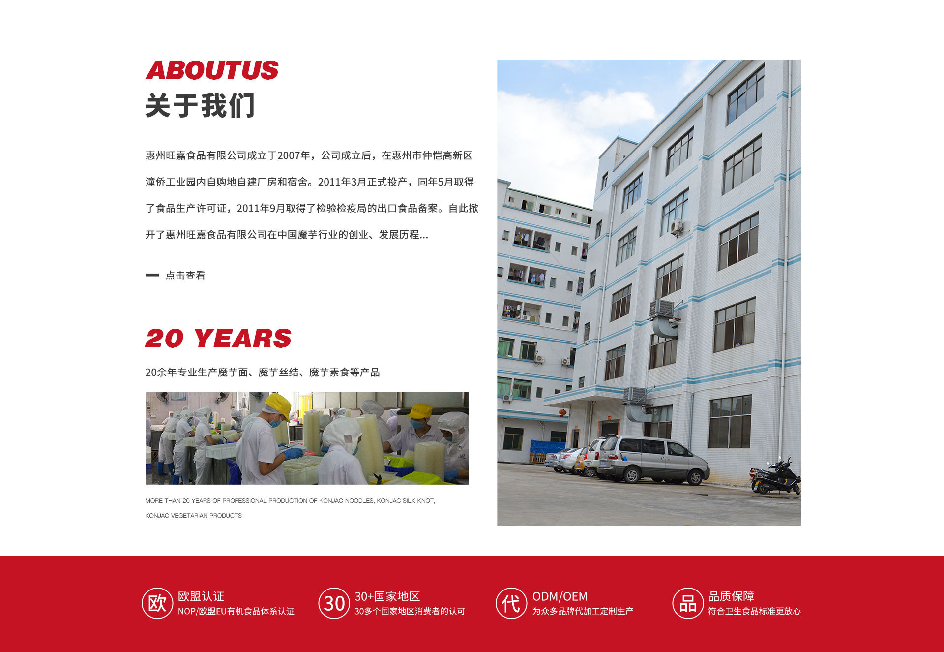 惠州旺嘉食品有限公司成立于2007年,公司成立后,在惠州市仲愷高新區(qū)潼僑工業(yè)園內(nèi)自購地自建廠房和宿舍。2011年3月正式投產(chǎn),同年5月取得了食品生產(chǎn)許可證,2011年9月取得了檢驗(yàn)檢疫局的出口食品備案。自此掀開了惠州旺嘉食品有限公司在中國魔芋行業(yè)的創(chuàng)業(yè)、發(fā)展歷程。 惠州旺嘉食品有限公司自投產(chǎn)以來,積極引進(jìn)先進(jìn)的管理經(jīng)驗(yàn),管理人才,和國外的先進(jìn)設(shè)備。經(jīng)過不懈努力,公司先后通過了國內(nèi)外多家認(rèn)證機(jī)構(gòu)的認(rèn)證,他們是: HACCP國際食品安全體系認(rèn)證;BRC國際食品安全體系認(rèn)證;IFS國際食品安全體系認(rèn)證;美國NOP\歐盟EU\日本JAS等有機(jī)食品體系認(rèn)證;美國FDA備案企業(yè);SA8000社會(huì)責(zé)任管理體系認(rèn)證;Halal和Kosher潔食認(rèn)證。惠州旺嘉食品有限公司生產(chǎn)的魔芋面系列,魔芋米系列,魔芋絲結(jié)系列,魔芋素食系列,魔芋調(diào)味系列產(chǎn)品暢銷國內(nèi)外,得到了國內(nèi)外近40個(gè)國家和地區(qū)消費(fèi)者的認(rèn)可和好評(píng)!